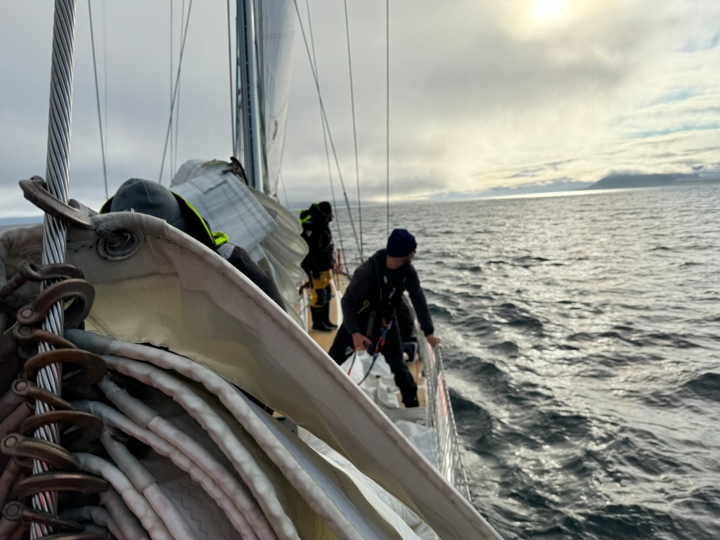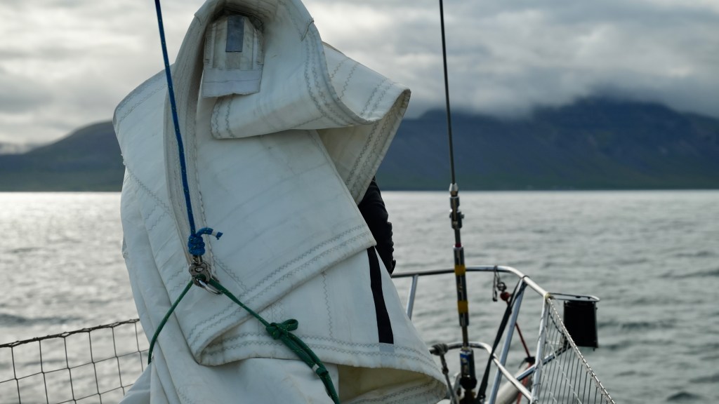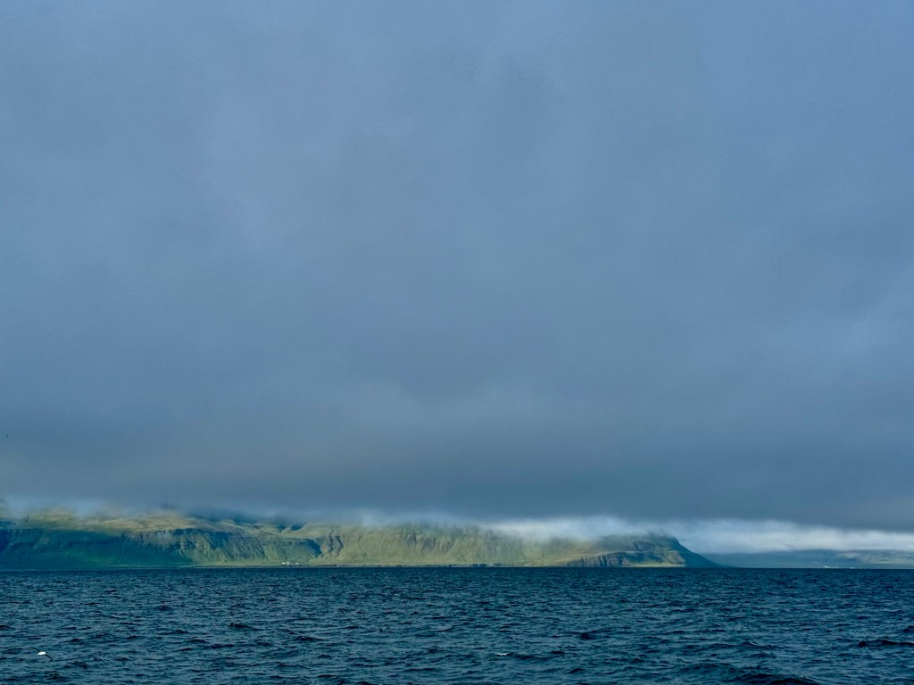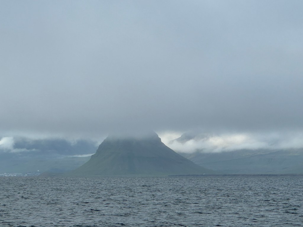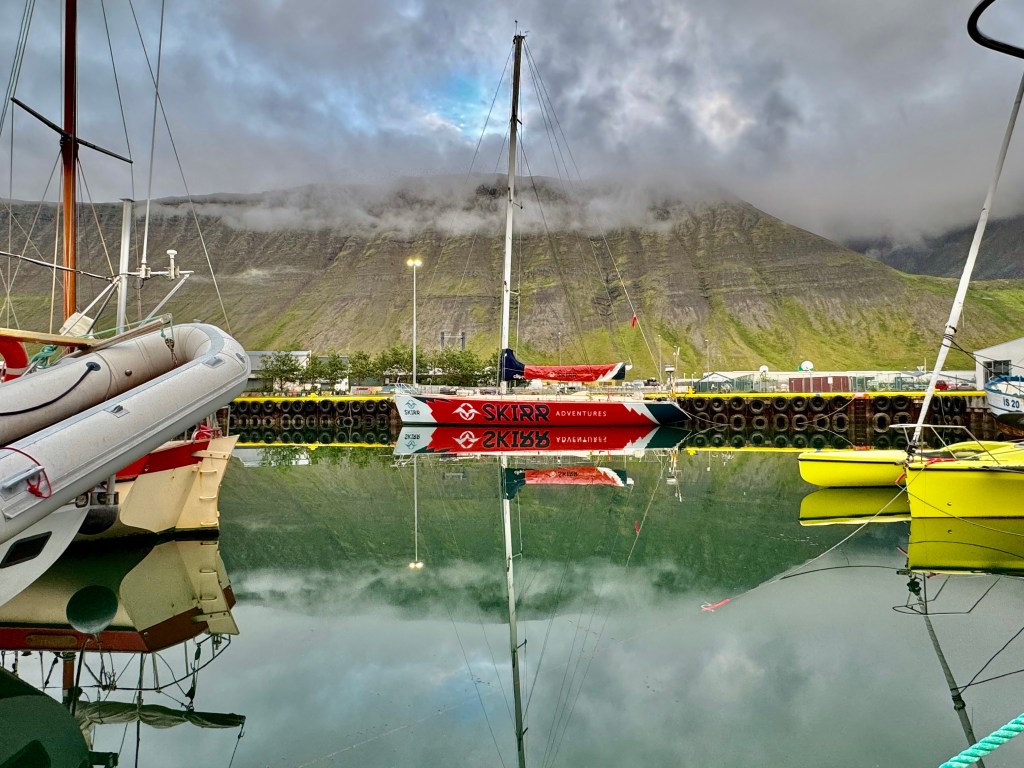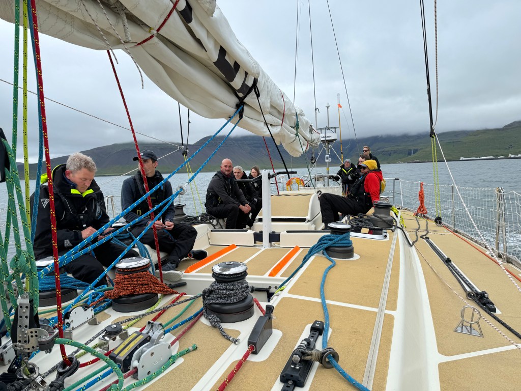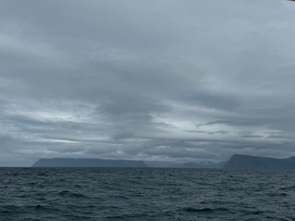Next morning at 6am after an extra class concert of sleeping Hippos the ships bell got us out of bed. Quick morning wash, dive to the heads at the dock, breakfast and ready we were for the safety brief. Another good reminder of how to protect ourselves while sailing the boat sound and safe under all conditions to come. A reminder of skip made its round that it might be a good advice to take care of potential sea sickness now as we will be heading straight over to Greenland this night. Wind was predicted to be moderate but there would be the old sea from the storm of the last few days. Pills, plasters and what not got applied. Safety brief done. Water filled, sails prepped, own full of hot water, clothes on, watch on duty on deck and ready to slip lines. The departure was uneventful. The sky was still grey from the rain of the last day. We passed the dock of the inner harbor, turned 180 degree into the canal out to the open fjord. We passed another cruise liner as we said farewell to Isafjördur.