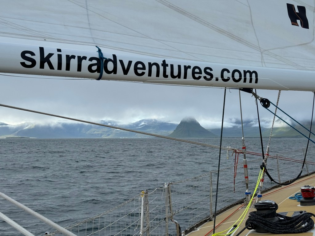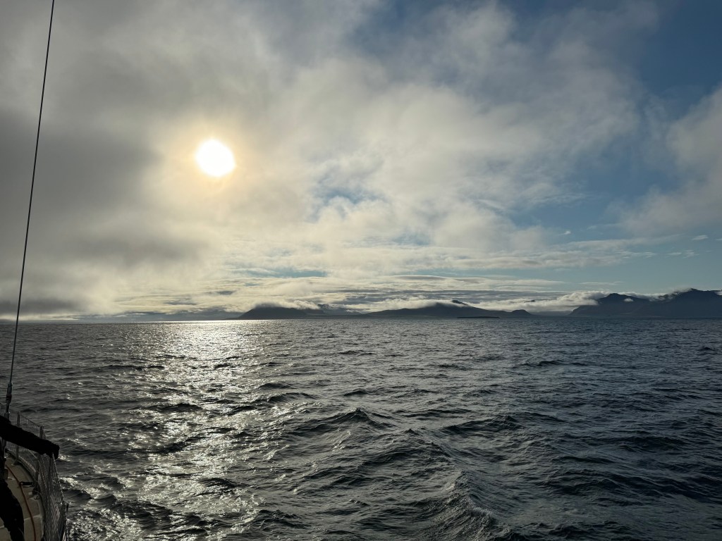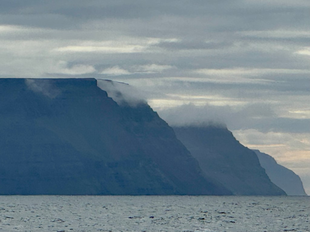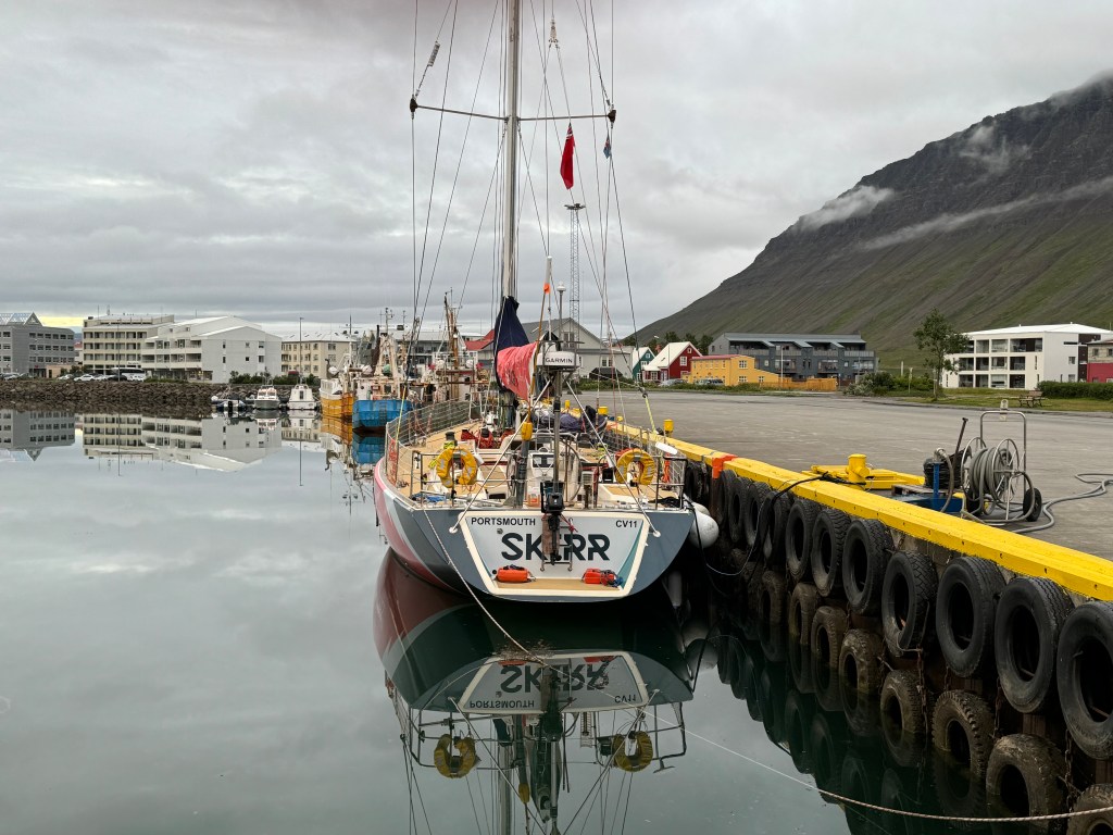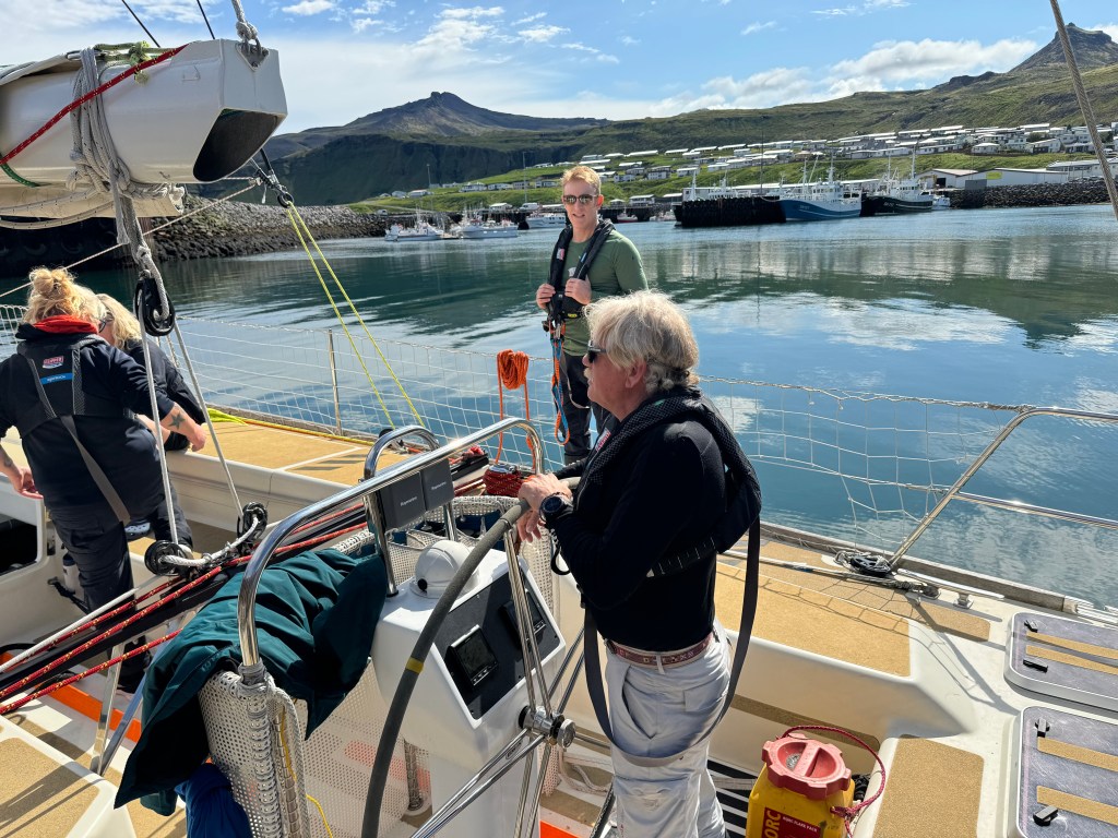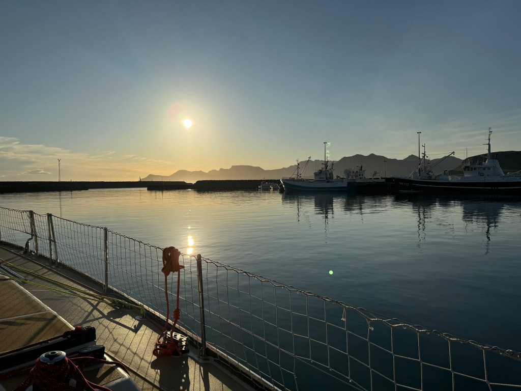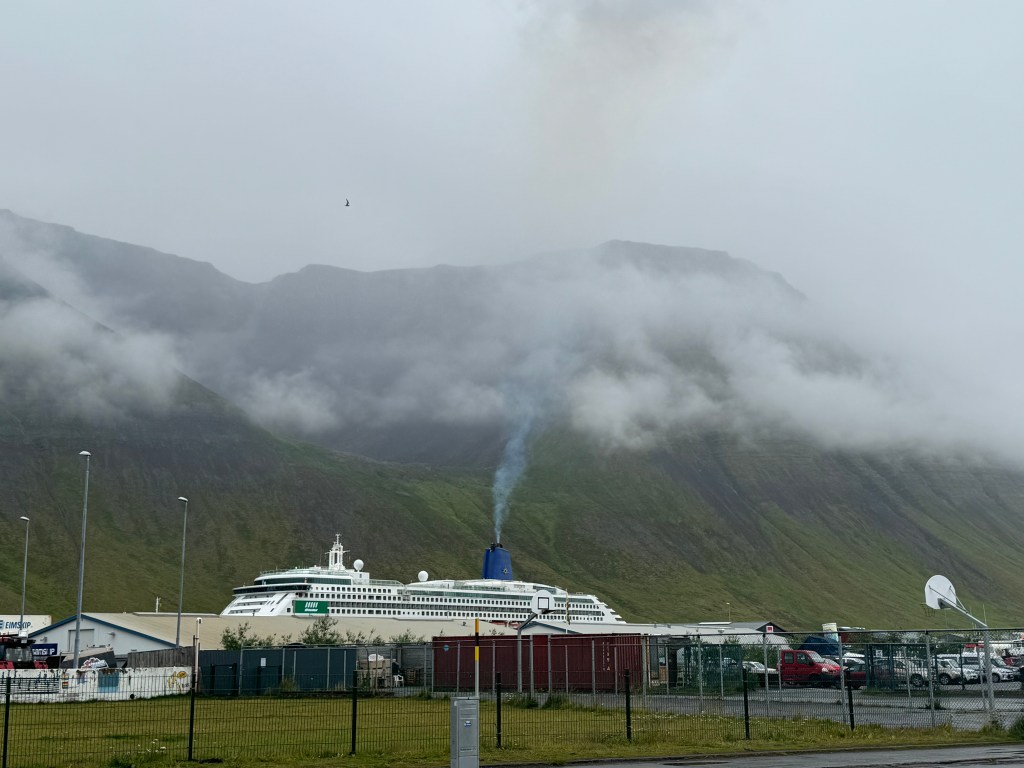 Next morning at 6am after an extra class concert of sleeping Hippos the ships bell got us out of bed. Quick morning wash, dive to the heads at the dock, breakfast and ready we were for the safety brief. Another good reminder of how to protect ourselves while sailing the boat sound and safe under all conditions to come. A reminder of skip made its round that it might be a good advice to take care of potential sea sickness now as we will be heading straight over to Greenland this night. Wind was predicted to be moderate but there would be the old sea from the storm of the last few days. Pills, plasters and what not got applied. Safety brief done. Water filled, sails prepped, own full of hot water, clothes on, watch on duty on deck and ready to slip lines. The departure was uneventful. The sky was still grey from the rain of the last day. We passed the dock of the inner harbor, turned 180 degree into the canal out to the open fjord. We passed another cruise liner as we said farewell to Isafjördur.