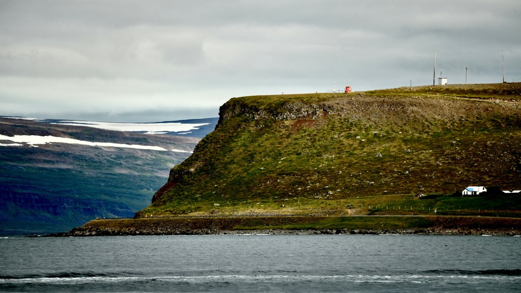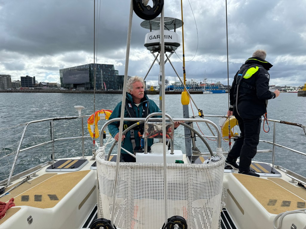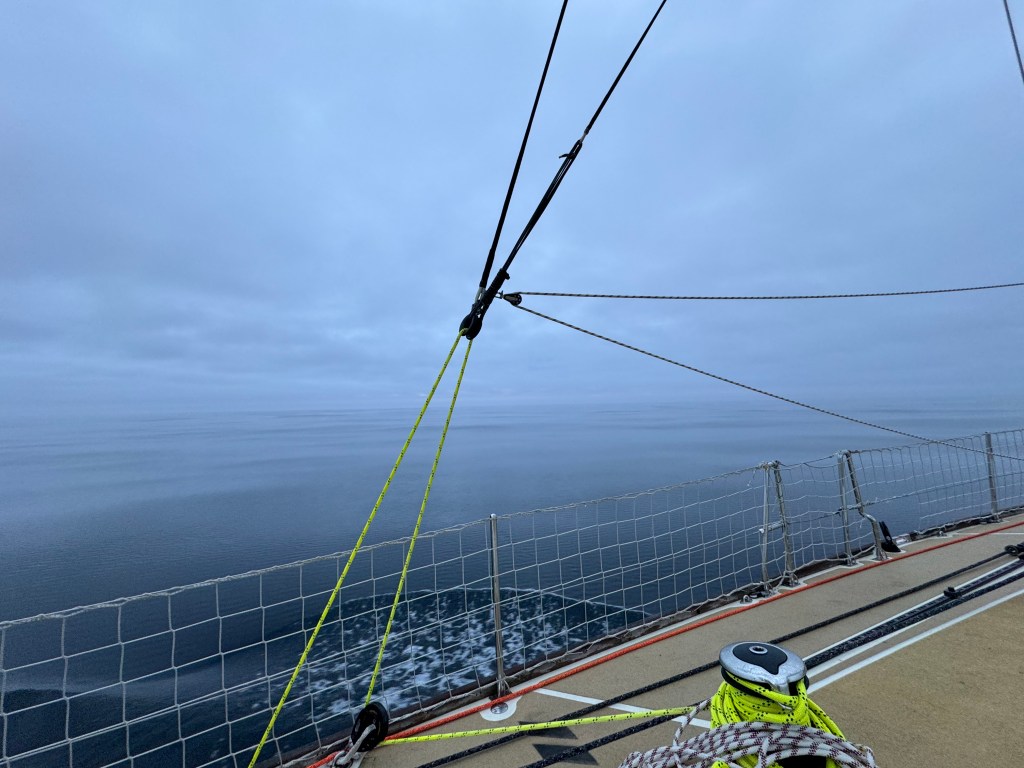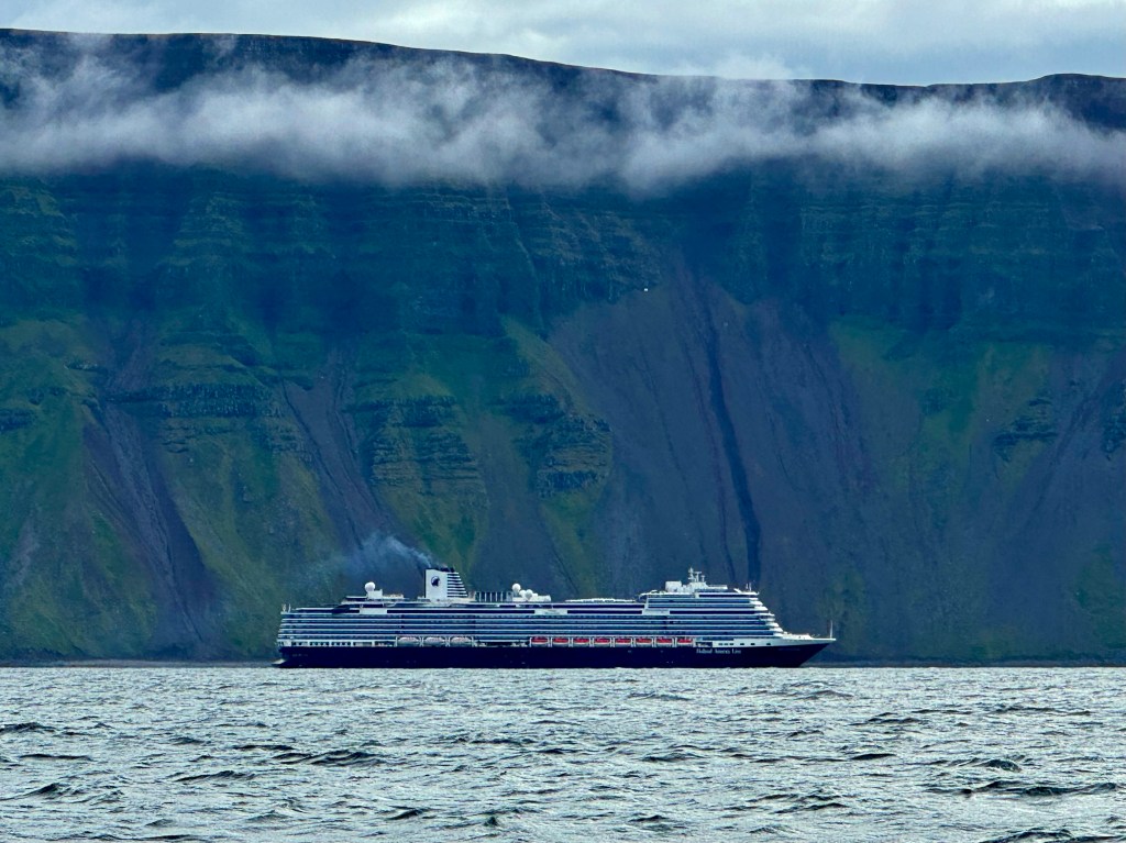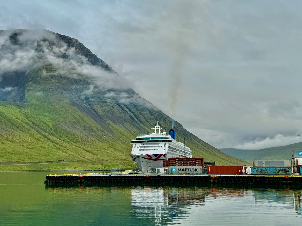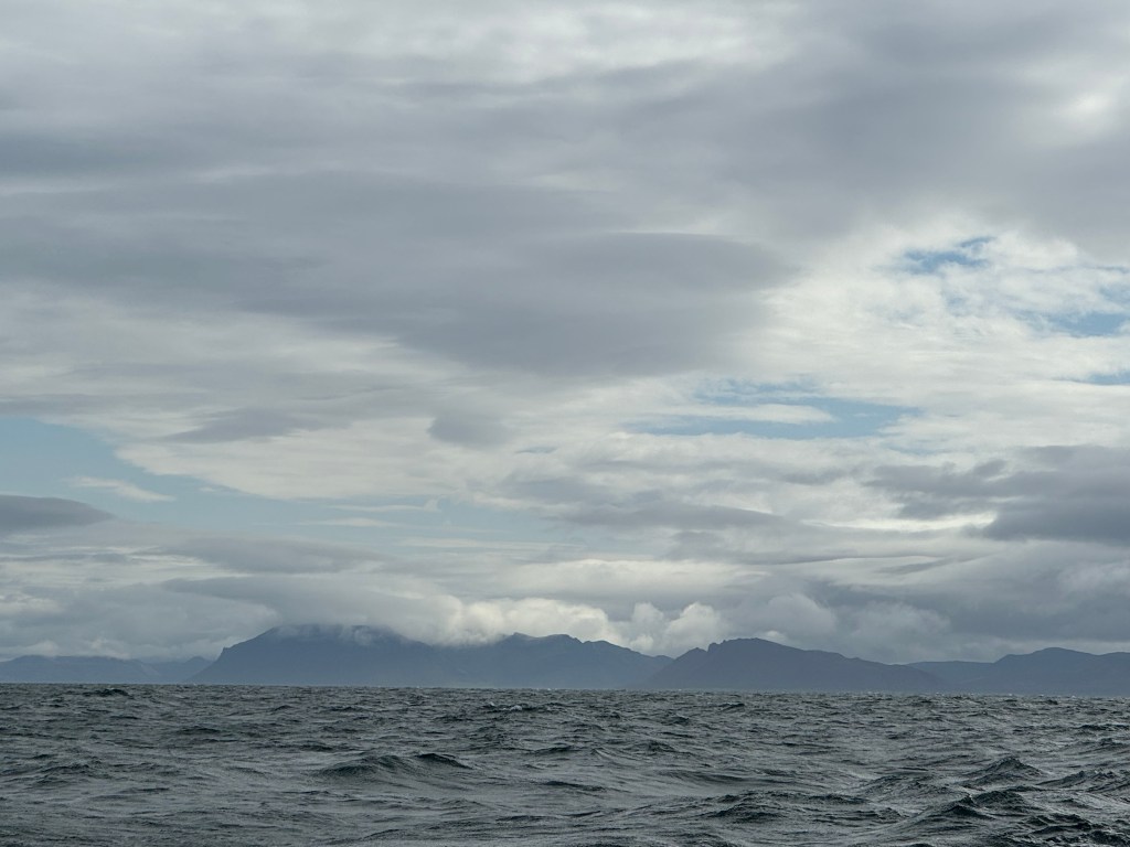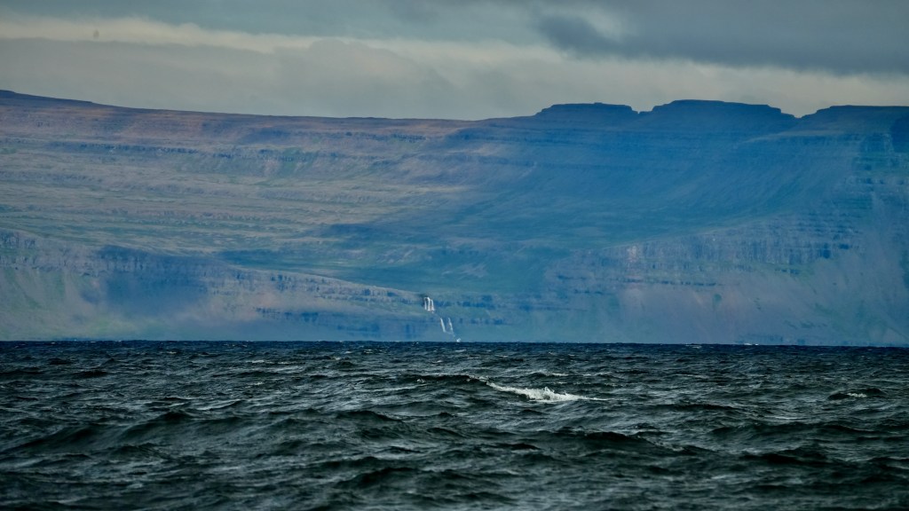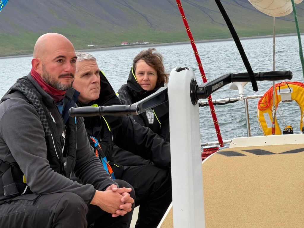 Next morning at 6am after an extra class concert of sleeping Hippos the ships bell got us out of bed. Quick morning wash, dive to the heads at the dock, breakfast and ready we were for the safety brief. Another good reminder of how to protect ourselves while sailing the boat sound and safe under all conditions to come. A reminder of skip made its round that it might be a good advice to take care of potential sea sickness now as we will be heading straight over to Greenland this night. Wind was predicted to be moderate but there would be the old sea from the storm of the last few days. Pills, plasters and what not got applied. Safety brief done. Water filled, sails prepped, own full of hot water, clothes on, watch on duty on deck and ready to slip lines. The departure was uneventful. The sky was still grey from the rain of the last day. We passed the dock of the inner harbor, turned 180 degree into the canal out to the open fjord. We passed another cruise liner as we said farewell to Isafjördur.