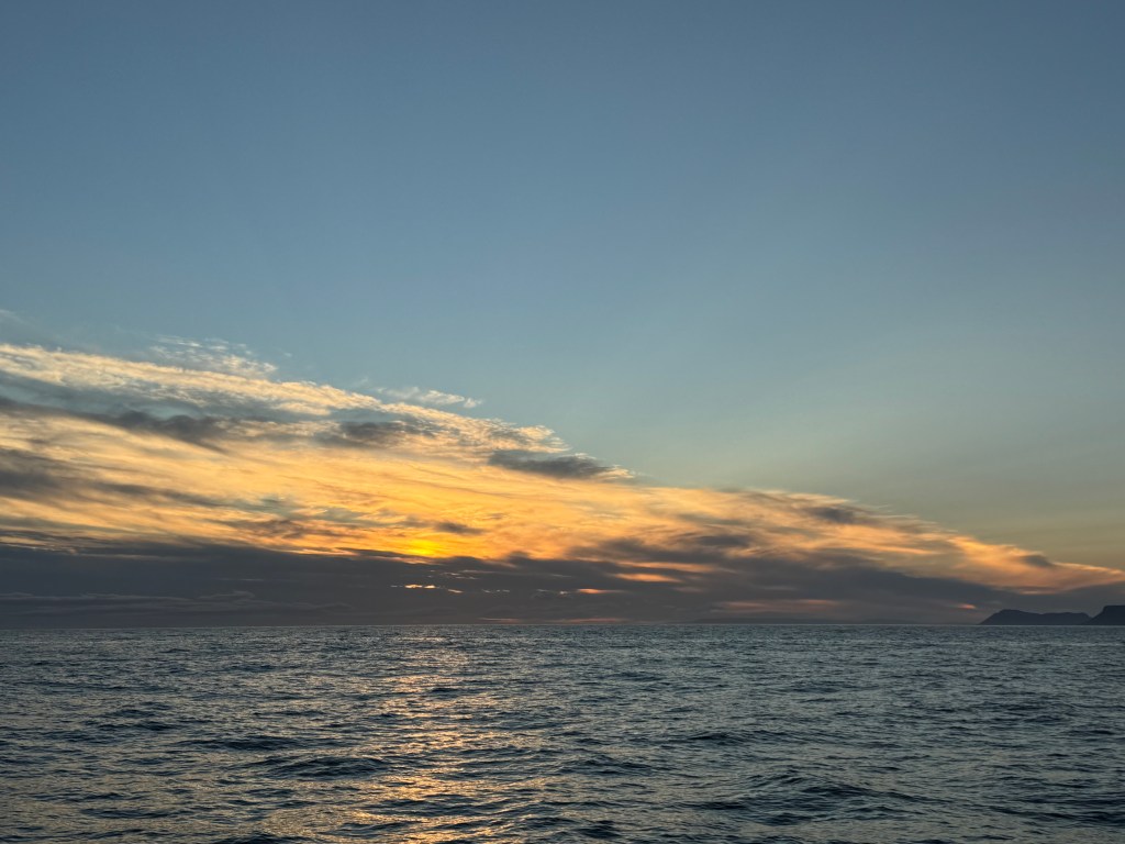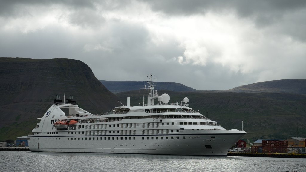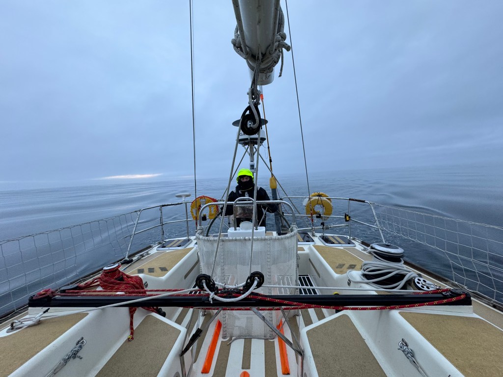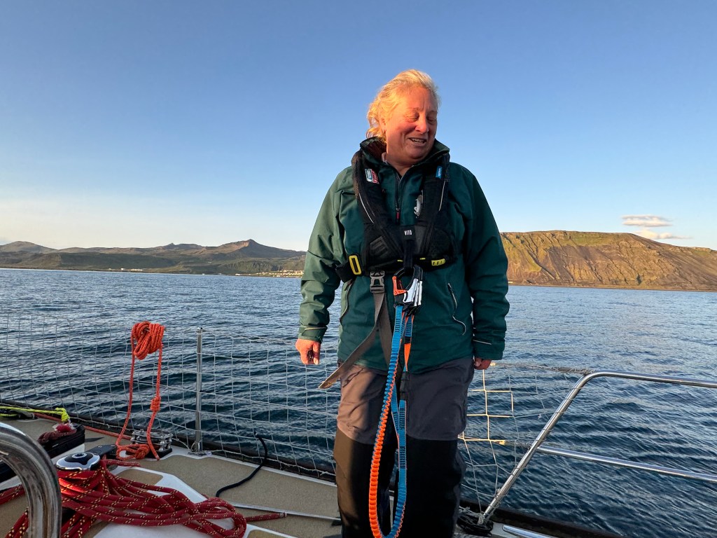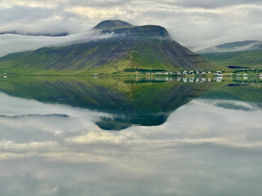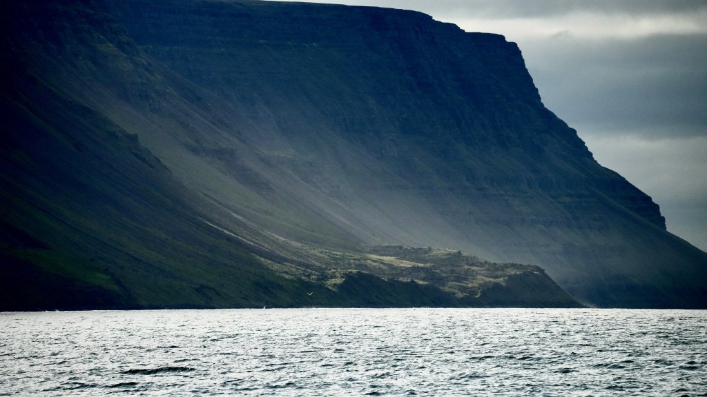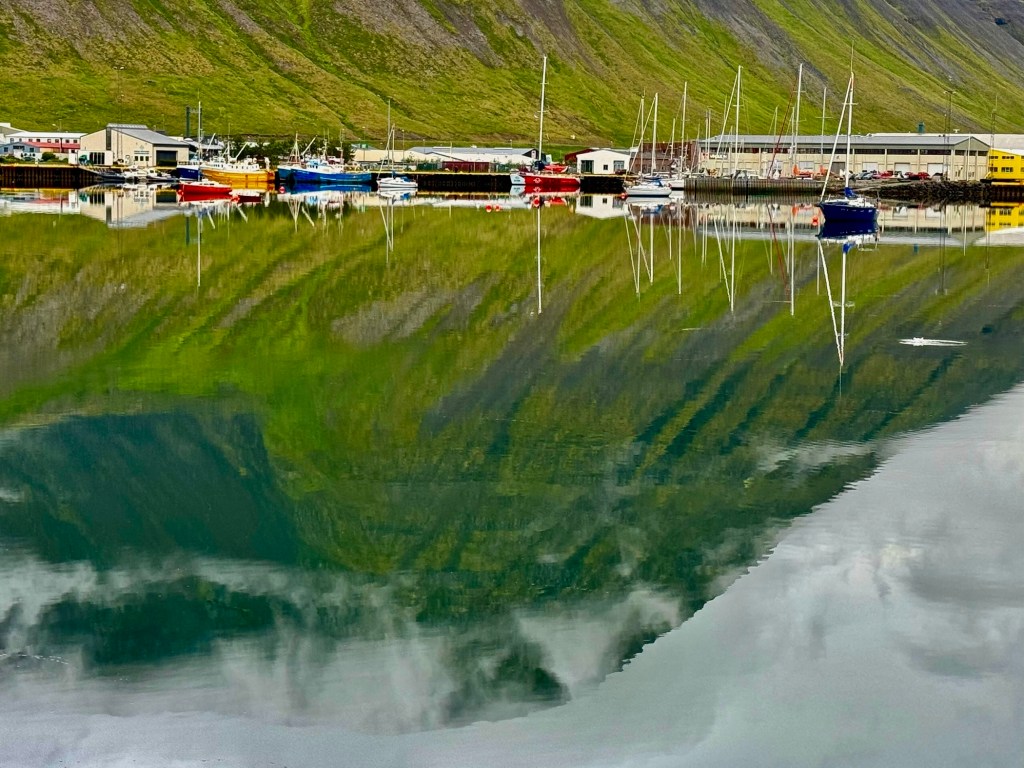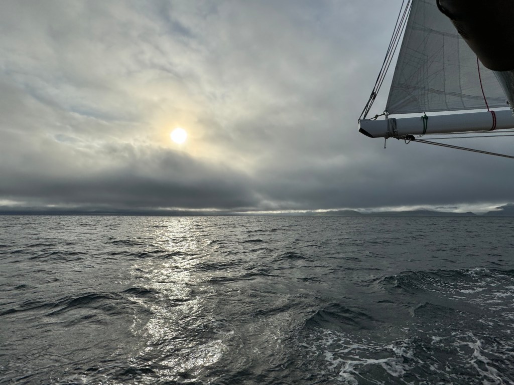 Next morning at 6am after an extra class concert of sleeping Hippos the ships bell got us out of bed. Quick morning wash, dive to the heads at the dock, breakfast and ready we were for the safety brief. Another good reminder of how to protect ourselves while sailing the boat sound and safe under all conditions to come. A reminder of skip made its round that it might be a good advice to take care of potential sea sickness now as we will be heading straight over to Greenland this night. Wind was predicted to be moderate but there would be the old sea from the storm of the last few days. Pills, plasters and what not got applied. Safety brief done. Water filled, sails prepped, own full of hot water, clothes on, watch on duty on deck and ready to slip lines. The departure was uneventful. The sky was still grey from the rain of the last day. We passed the dock of the inner harbor, turned 180 degree into the canal out to the open fjord. We passed another cruise liner as we said farewell to Isafjördur.