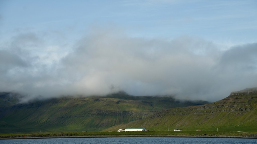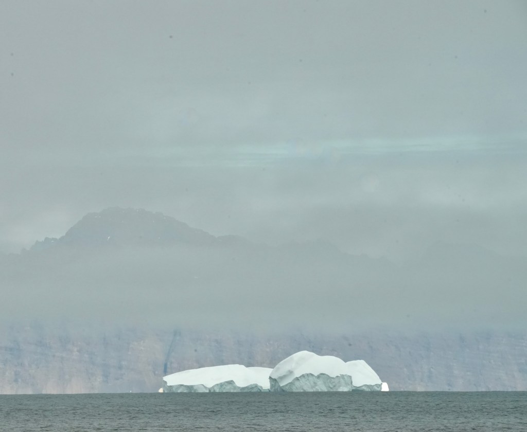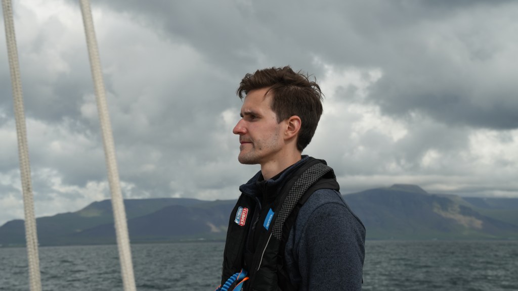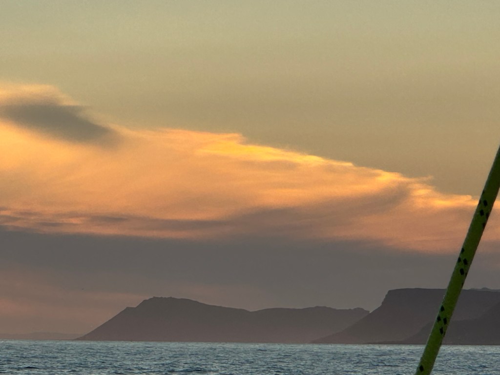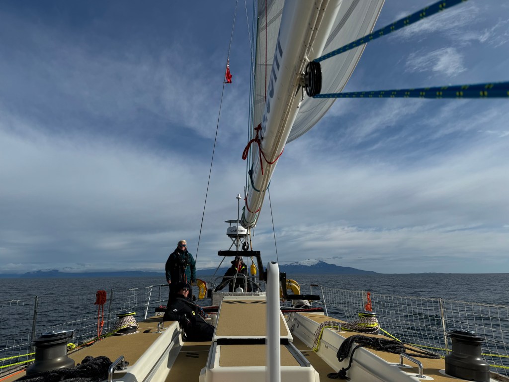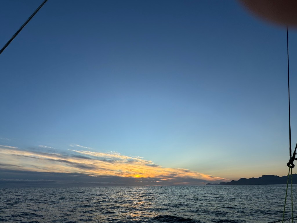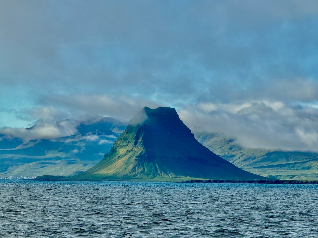 Next morning at 6am after an extra class concert of sleeping Hippos the ships bell got us out of bed. Quick morning wash, dive to the heads at the dock, breakfast and ready we were for the safety brief. Another good reminder of how to protect ourselves while sailing the boat sound and safe under all conditions to come. A reminder of skip made its round that it might be a good advice to take care of potential sea sickness now as we will be heading straight over to Greenland this night. Wind was predicted to be moderate but there would be the old sea from the storm of the last few days. Pills, plasters and what not got applied. Safety brief done. Water filled, sails prepped, own full of hot water, clothes on, watch on duty on deck and ready to slip lines. The departure was uneventful. The sky was still grey from the rain of the last day. We passed the dock of the inner harbor, turned 180 degree into the canal out to the open fjord. We passed another cruise liner as we said farewell to Isafjördur.