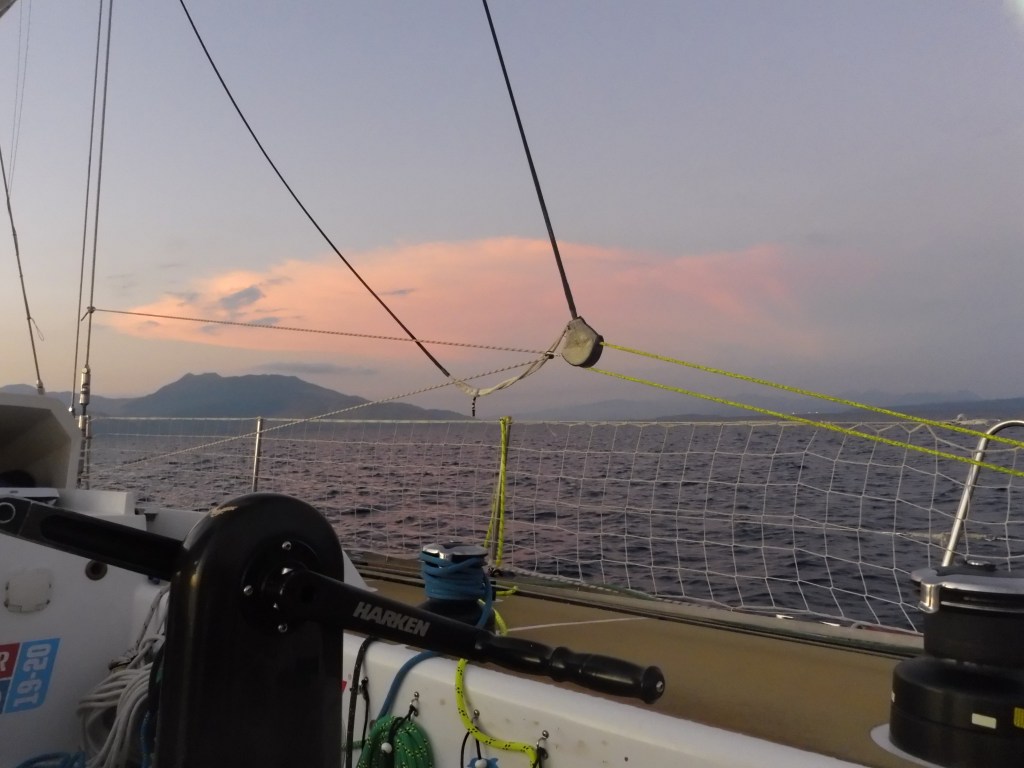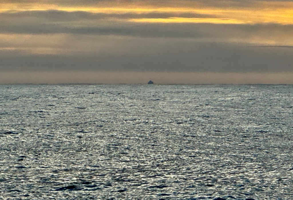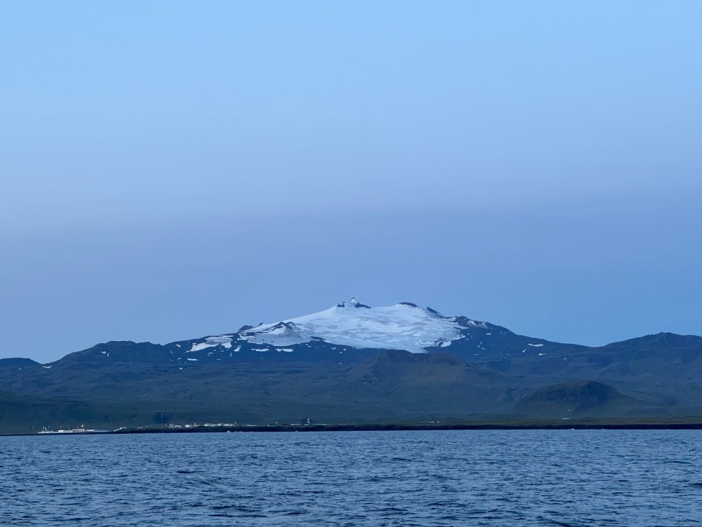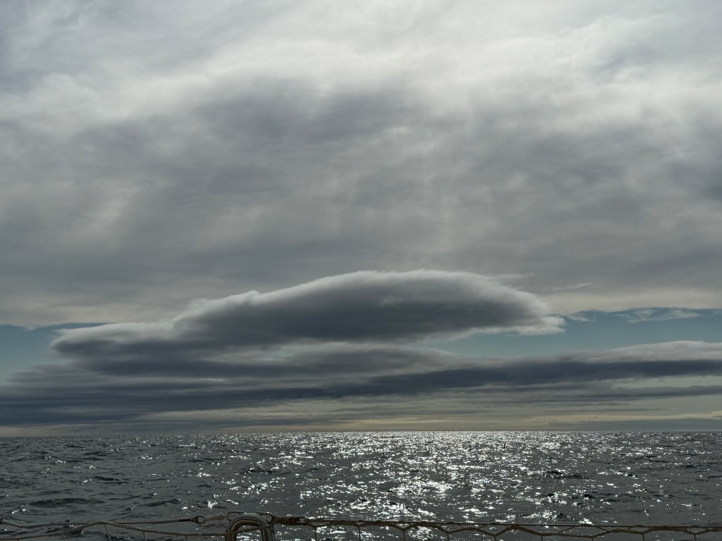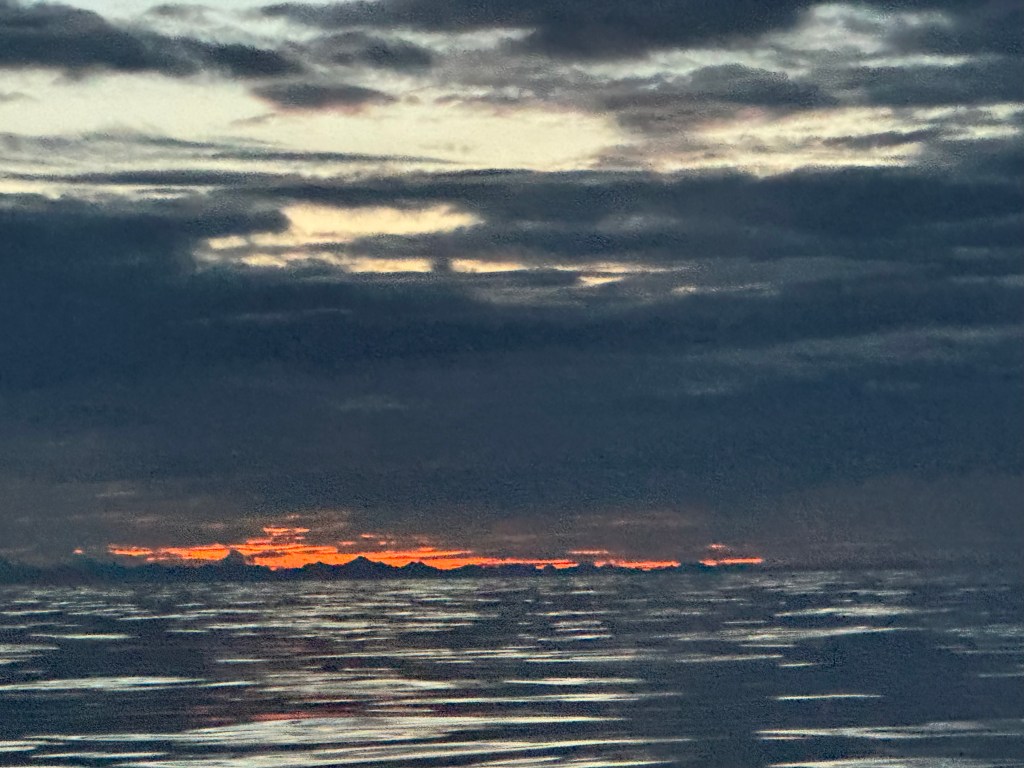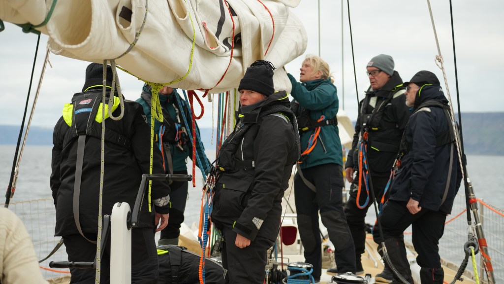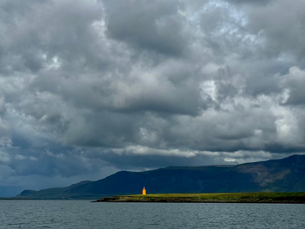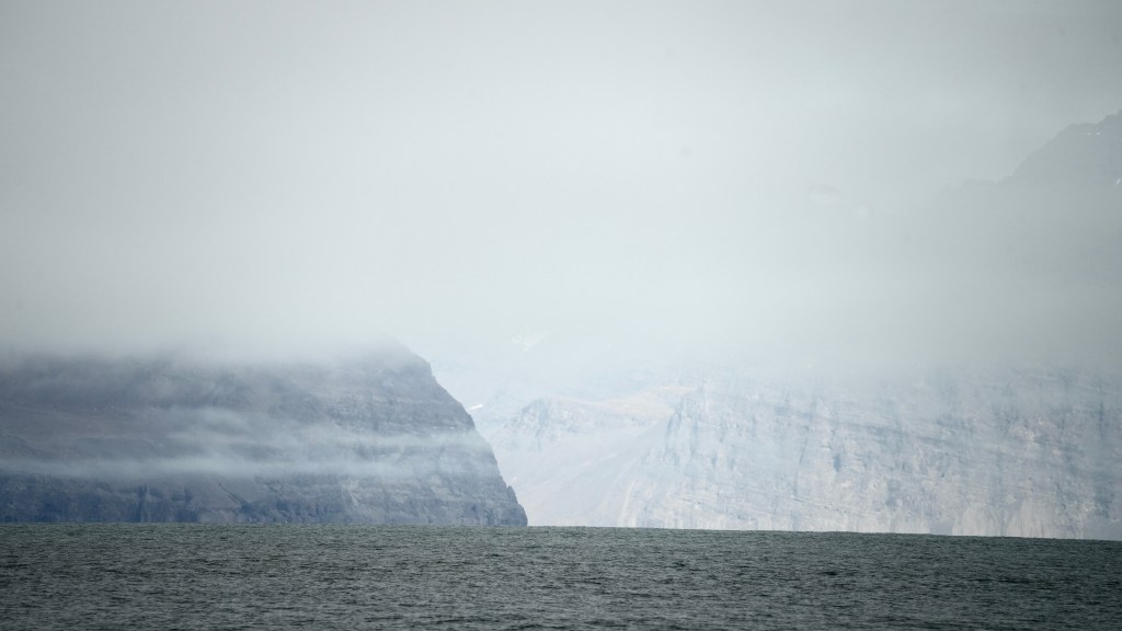 Next morning at 6am after an extra class concert of sleeping Hippos the ships bell got us out of bed. Quick morning wash, dive to the heads at the dock, breakfast and ready we were for the safety brief. Another good reminder of how to protect ourselves while sailing the boat sound and safe under all conditions to come. A reminder of skip made its round that it might be a good advice to take care of potential sea sickness now as we will be heading straight over to Greenland this night. Wind was predicted to be moderate but there would be the old sea from the storm of the last few days. Pills, plasters and what not got applied. Safety brief done. Water filled, sails prepped, own full of hot water, clothes on, watch on duty on deck and ready to slip lines. The departure was uneventful. The sky was still grey from the rain of the last day. We passed the dock of the inner harbor, turned 180 degree into the canal out to the open fjord. We passed another cruise liner as we said farewell to Isafjördur.