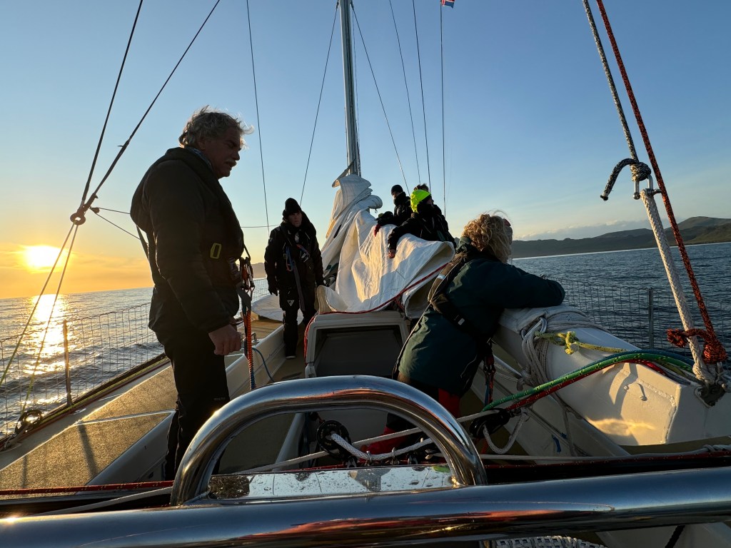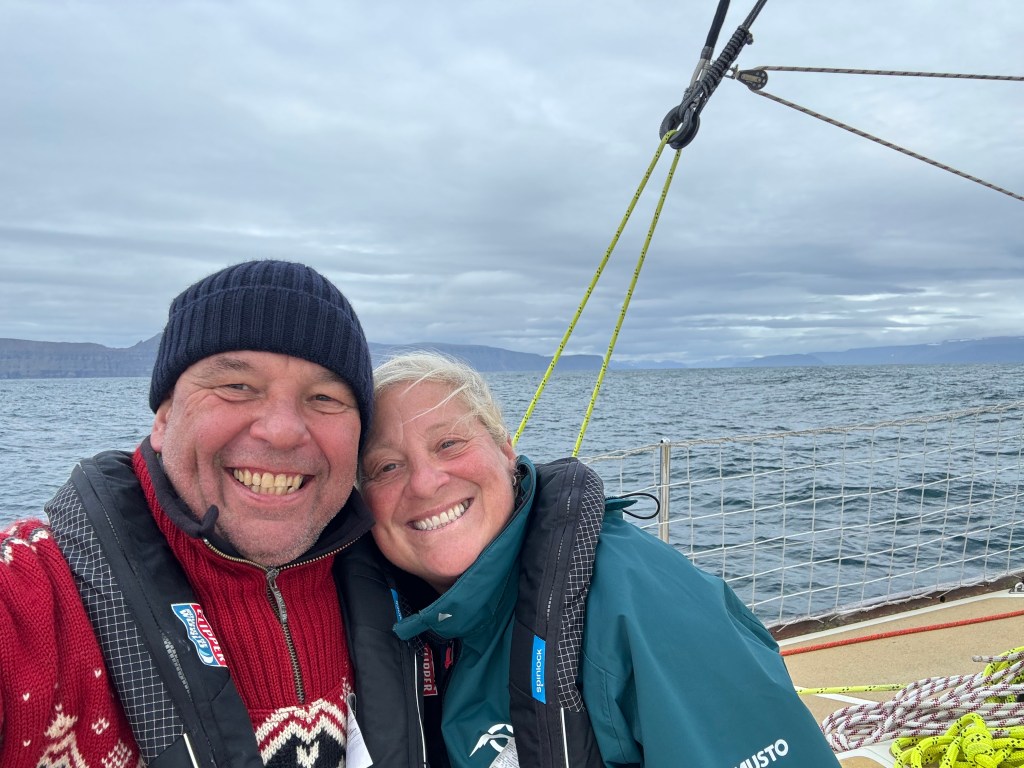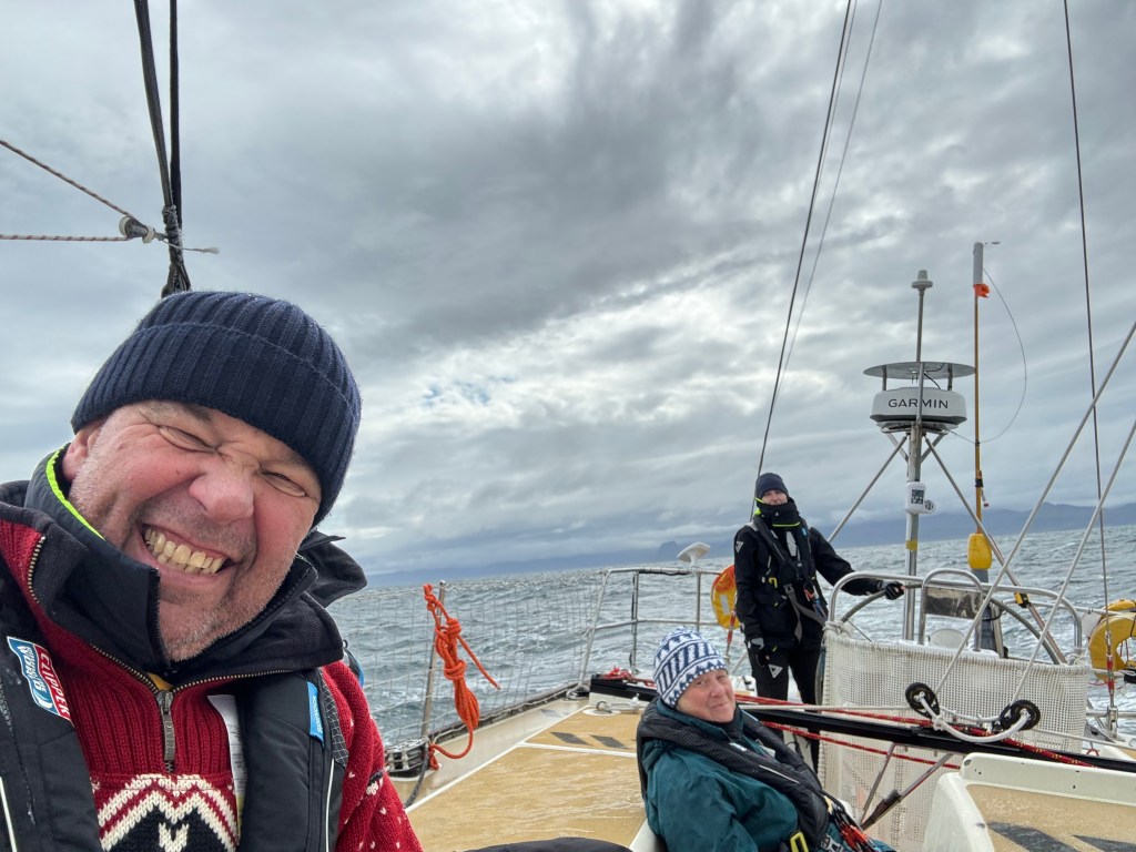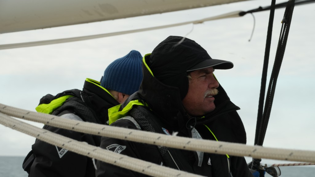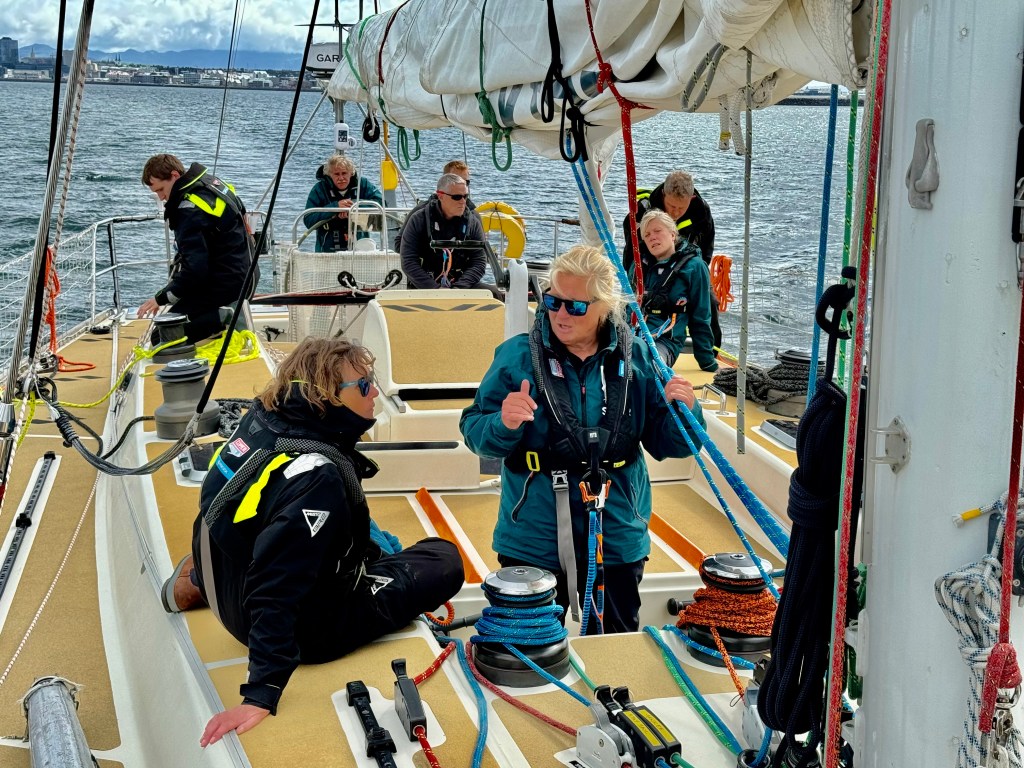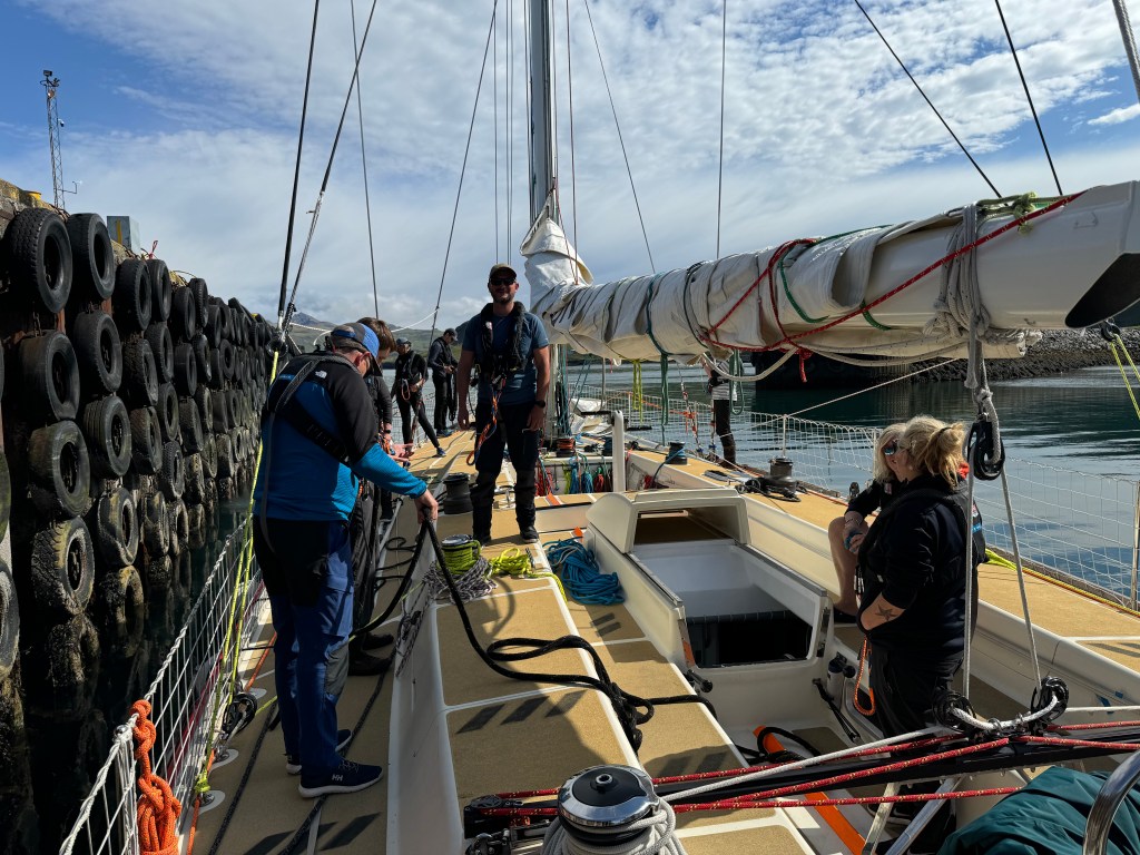 The briefing went seamless with the name and sailing introduction round. The 12 of us were Pam, Mel, Kaz, Karen, Maggie, Willie, Tom, Maxime, Stephen, Ian, Jose and me divided again into three watches this time of 4. We also had a new first mate as Sascha had to be replaced for a refit job at Clipper and it was Rachel, former WTC watch leader and winner of the Golden Globe Race crew on Maiden, this famous female driven racer. And with Wavy and Kitty it made us a crew of 15 crusaders. The Ghetto was open for bunk distribution, the collateral of SKIRR had been handed out. Skip had shared his plan to slip line at 14:00 next day when we headed out to the Husiet for crew dinner. It was awesome and first stories were shared about the endless experience that this crew gathered over the past. And expectations were voiced considering getting to sea tomorrow. I showed a few Berg pictures from the previous leg which fueled expectations. Skip took ma aside and asked to be careful as there might be bad weather, sea monsters and whatnot that might prevent us from seeing any ice. Aynway the fire was lit for Greenland. We were ready and headed back in peace with the world for our next adventure.