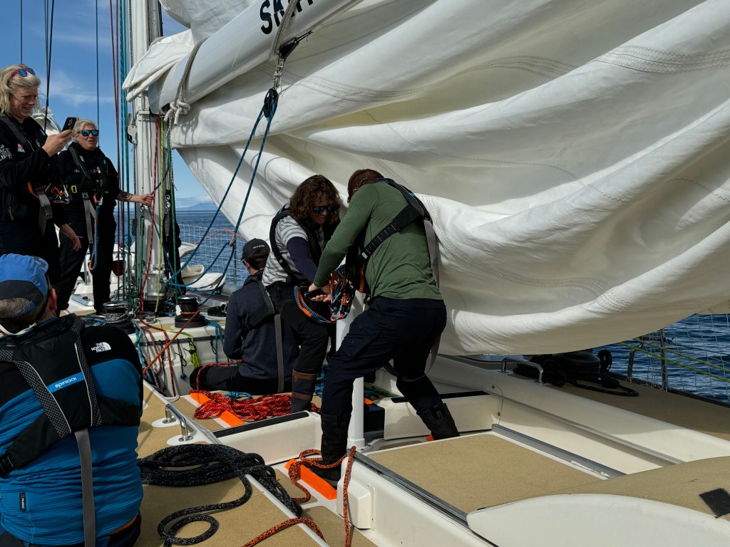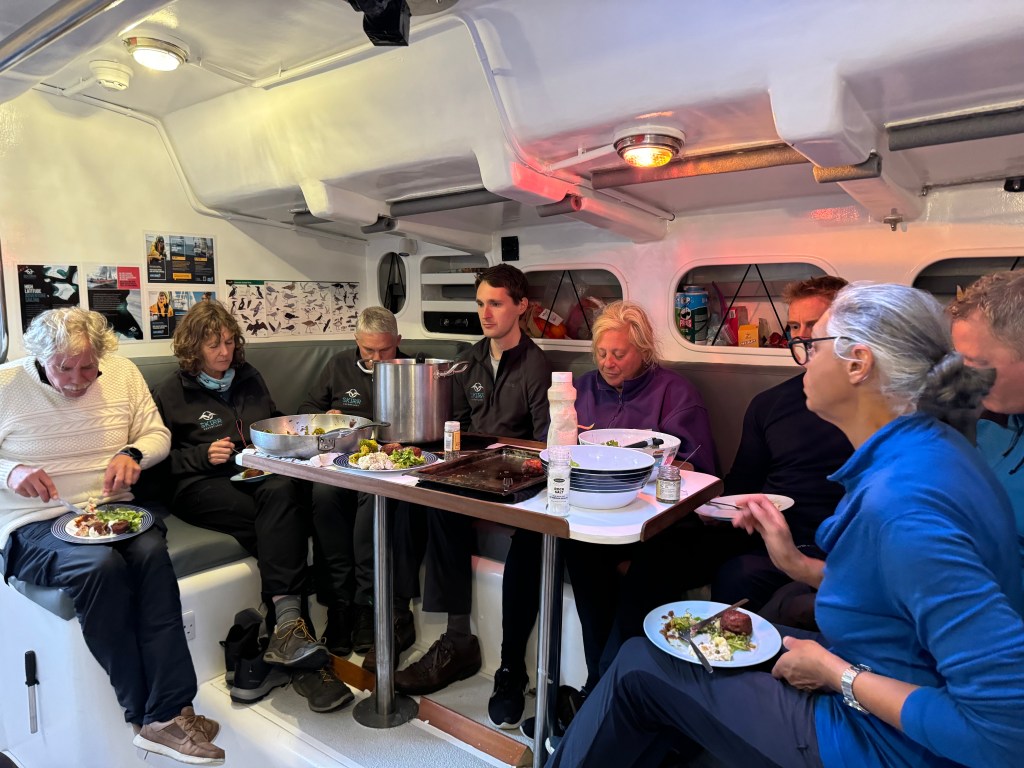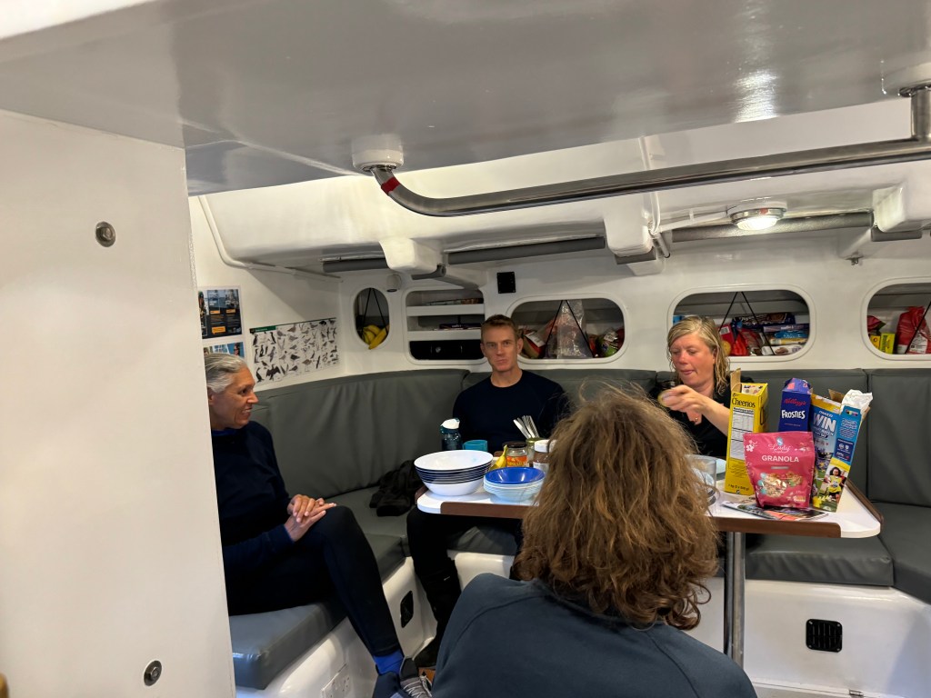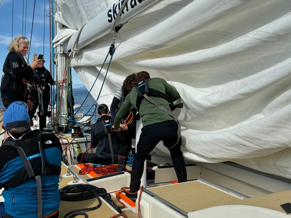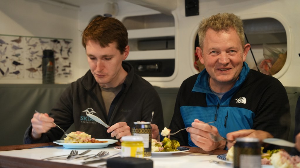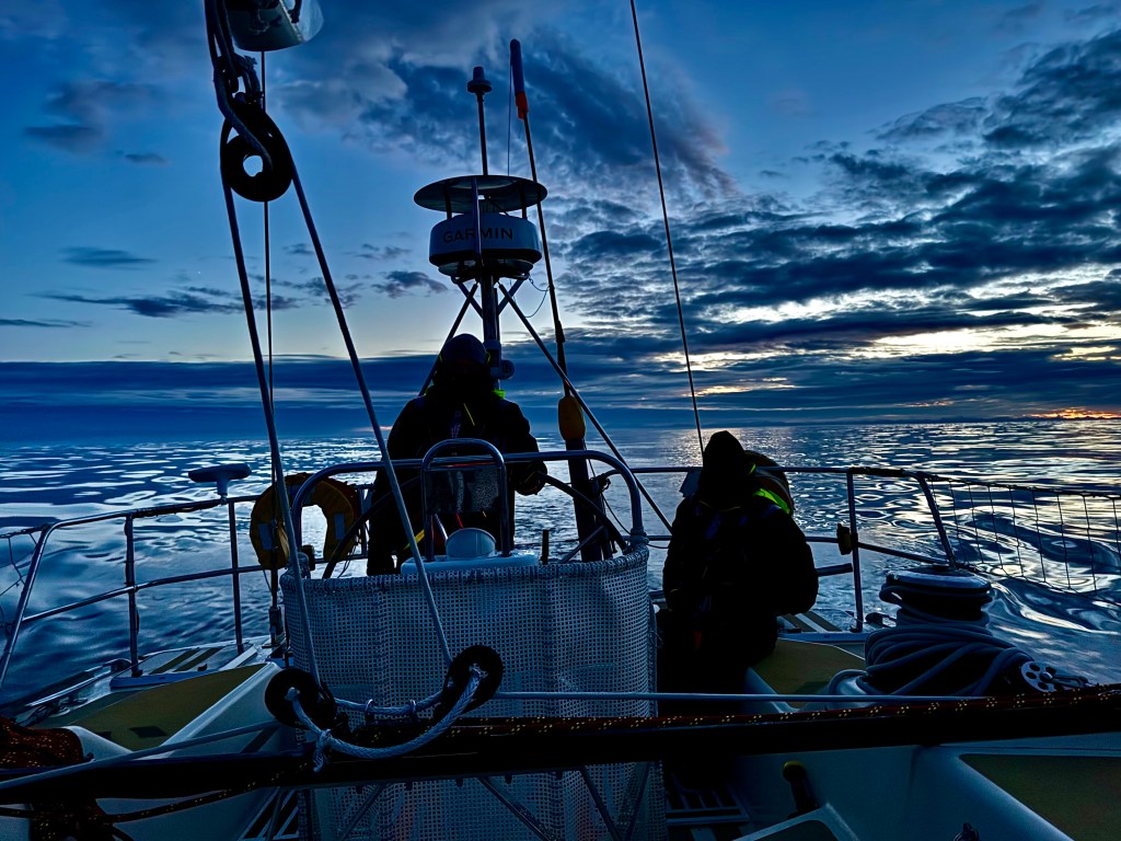 The briefing went seamless with the name and sailing introduction round. The 12 of us were Pam, Mel, Kaz, Karen, Maggie, Willie, Tom, Maxime, Stephen, Ian, Jose and me divided again into three watches this time of 4. We also had a new first mate as Sascha had to be replaced for a refit job at Clipper and it was Rachel, former WTC watch leader and winner of the Golden Globe Race crew on Maiden, this famous female driven racer. And with Wavy and Kitty it made us a crew of 15 crusaders. The Ghetto was open for bunk distribution, the collateral of SKIRR had been handed out. Skip had shared his plan to slip line at 14:00 next day when we headed out to the Husiet for crew dinner. It was awesome and first stories were shared about the endless experience that this crew gathered over the past. And expectations were voiced considering getting to sea tomorrow. I showed a few Berg pictures from the previous leg which fueled expectations. Skip took ma aside and asked to be careful as there might be bad weather, sea monsters and whatnot that might prevent us from seeing any ice. Aynway the fire was lit for Greenland. We were ready and headed back in peace with the world for our next adventure.