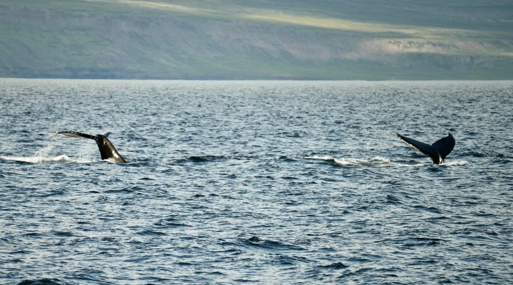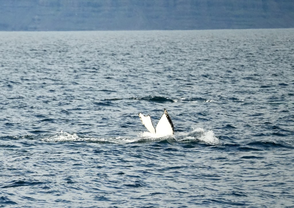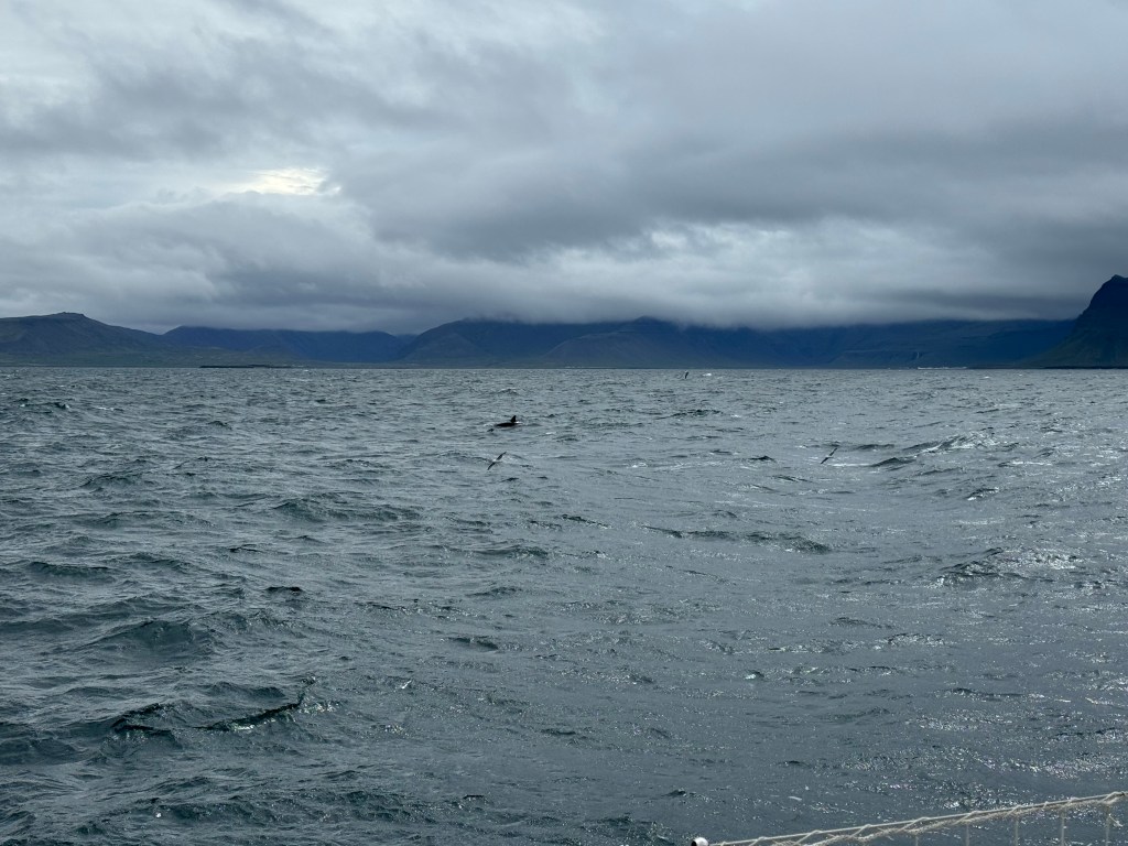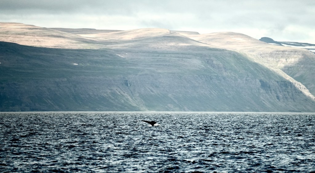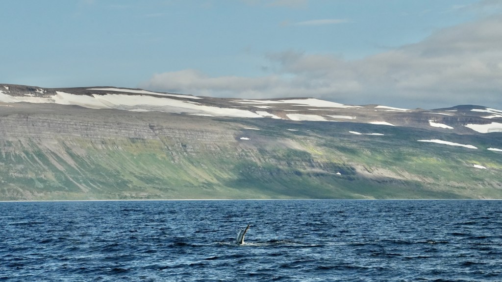 The other day, when skip and I sat in the cockpit we were visited by an Icelander who was curious about thew boat and wanted to look inside. He told us that this outer fjord is the home of 80 humpback whales. Whale watching here has a success rate of 100%. I almost had forgotten about it when someone from our crew screamed whale ahead, 1 o clock. And another one got sighted and another and another. Thjey were all north of our course. Rachel asked for permission to alter the course. Permission was granted and we turned North right into the pack.