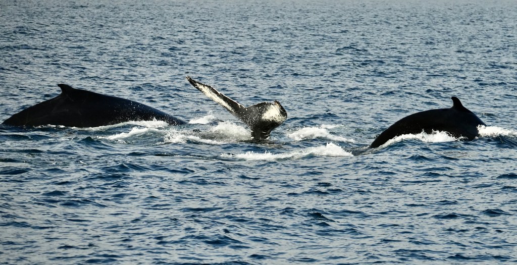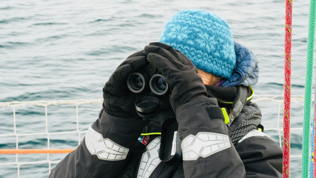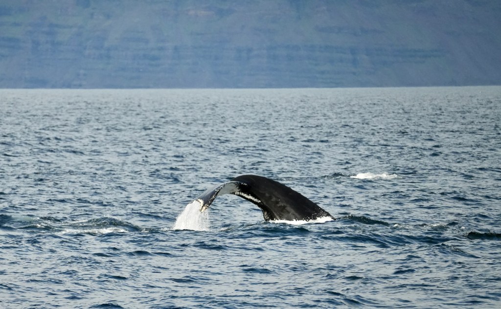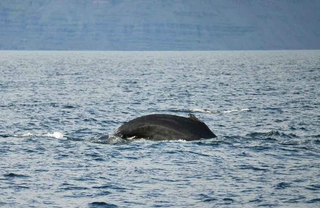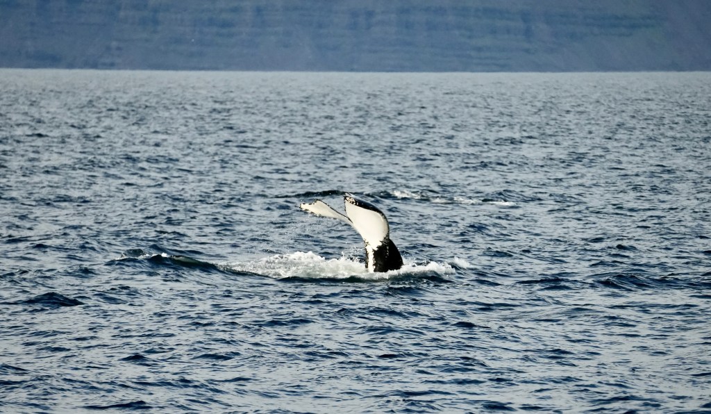 The other day, when skip and I sat in the cockpit we were visited by an Icelander who was curious about thew boat and wanted to look inside. He told us that this outer fjord is the home of 80 humpback whales. Whale watching here has a success rate of 100%. I almost had forgotten about it when someone from our crew screamed whale ahead, 1 o clock. And another one got sighted and another and another. Thjey were all north of our course. Rachel asked for permission to alter the course. Permission was granted and we turned North right into the pack.