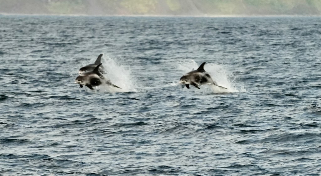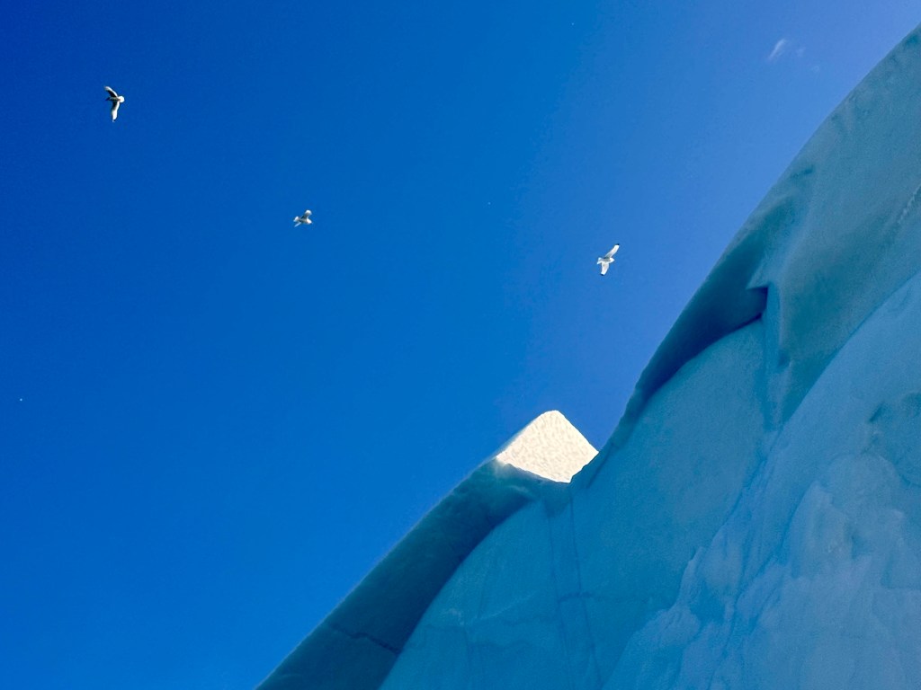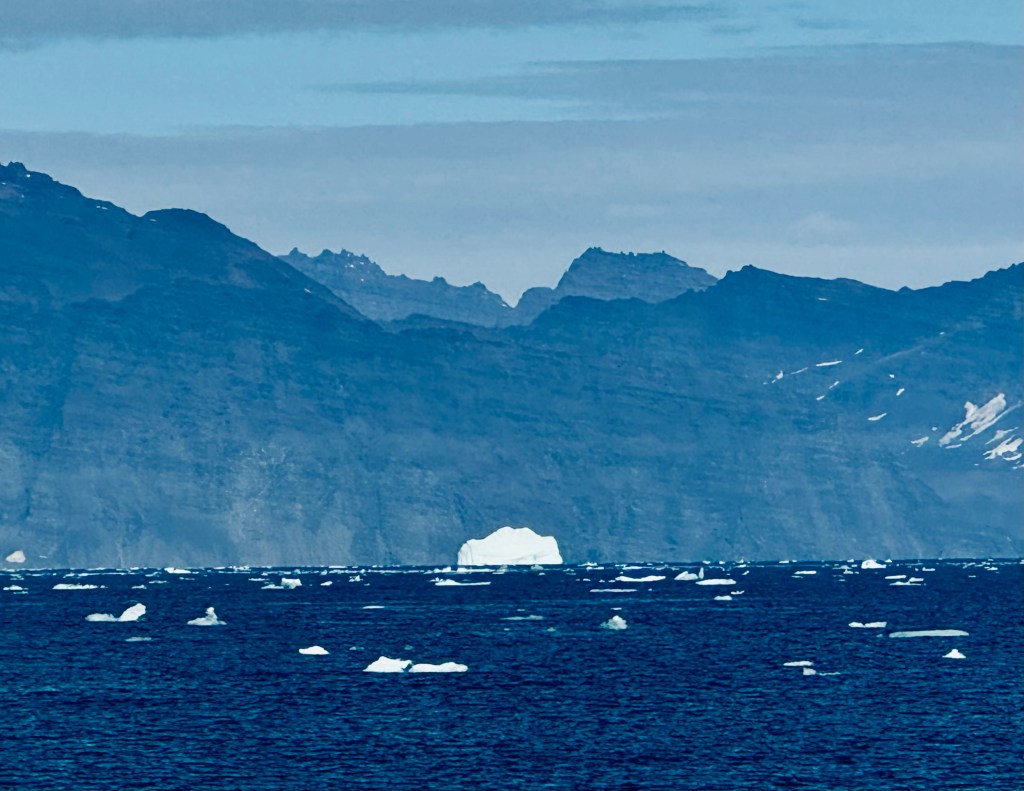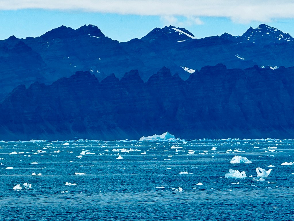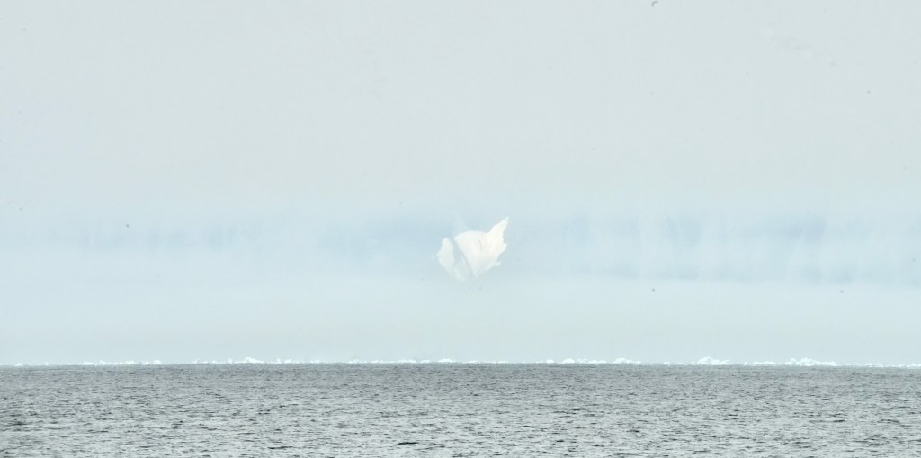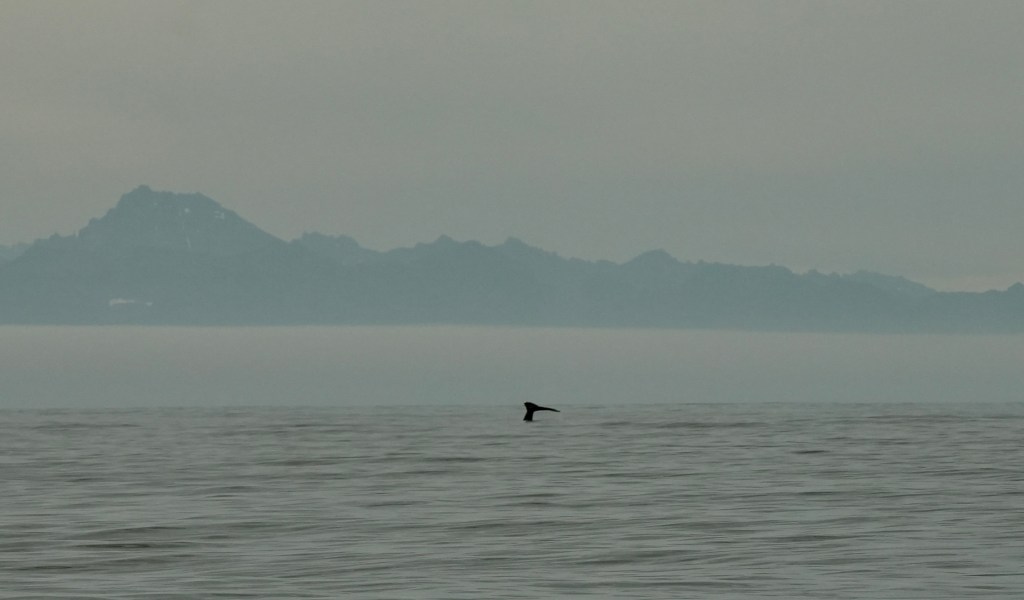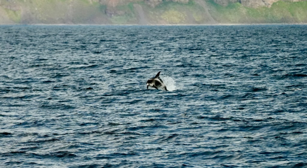 In the beginning we saw the just in the far distance gracefully bobbing along and occasionally they lifted their fluke up for a dive. The further we came to the North shore the closer we got to the whales. Suddenly, we were in a school of whales of about 20 animals. Blow fountains left right and center. We saw up to 5 whales in one spot. And again, and again the appeared, made 4 or 5 waving moves showing their back and fin before they dived off into the deep fjord. And all of this happened within the mystic scenery of this Fjord with its towering cliffs left and right and its vast opening to the Ocean. In the west was the sun bright and shiny providing us with the right light. The noise of the breathing whales and the graceful movements, all of that left us speechless. What a spectacle right at the beginning of our journey. And not enough as a stat. All of a sudden, a school of artic white backed dolphins torpedoed alongside for 15 minutes. The immense speed and their concerted low jumps out of the water was amazing. We still had 13 days ahead of us. This was a breathtaking start and what else could new expect? We headed West and sailed towards Greenland. More to come