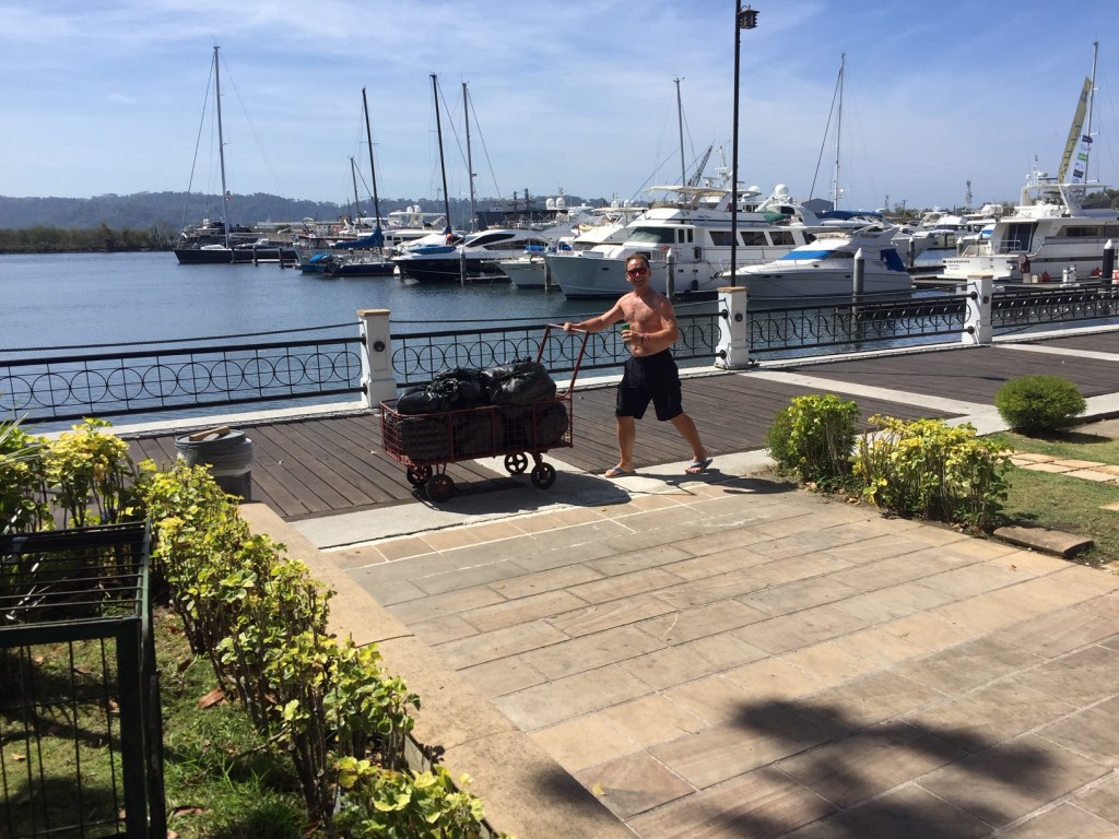 The review of today will be short and simple because I actually was very busy with Stephen to master a mountainous task today. We scheduled to meet at 08:30 in the boat house to review our strategy for victualing the boat for the short sprint race that is up ahead and will start the day after tomorrow. We both volunteered a couple of weeks ago on the WhatsApp group when Rich asked whether there would be somebody to help victualing. Honestly help is something that I am willing to provide whenever it will help the team to progress. After we arrived here in Subic Bay Stephen and I learned that help meant to take over the whole job. All of a sudden we were responsible for the supplies on the boat, the menu and the cooking instructing for this leg, two races, five days plus thirty-three day. And this involves not only food and drinks but also thinks like wet wipes, toilet paper, bin bags, cleaning stuff and whatever is needed to run the boat below deck and keeping the crew of 17th well fed and strong.