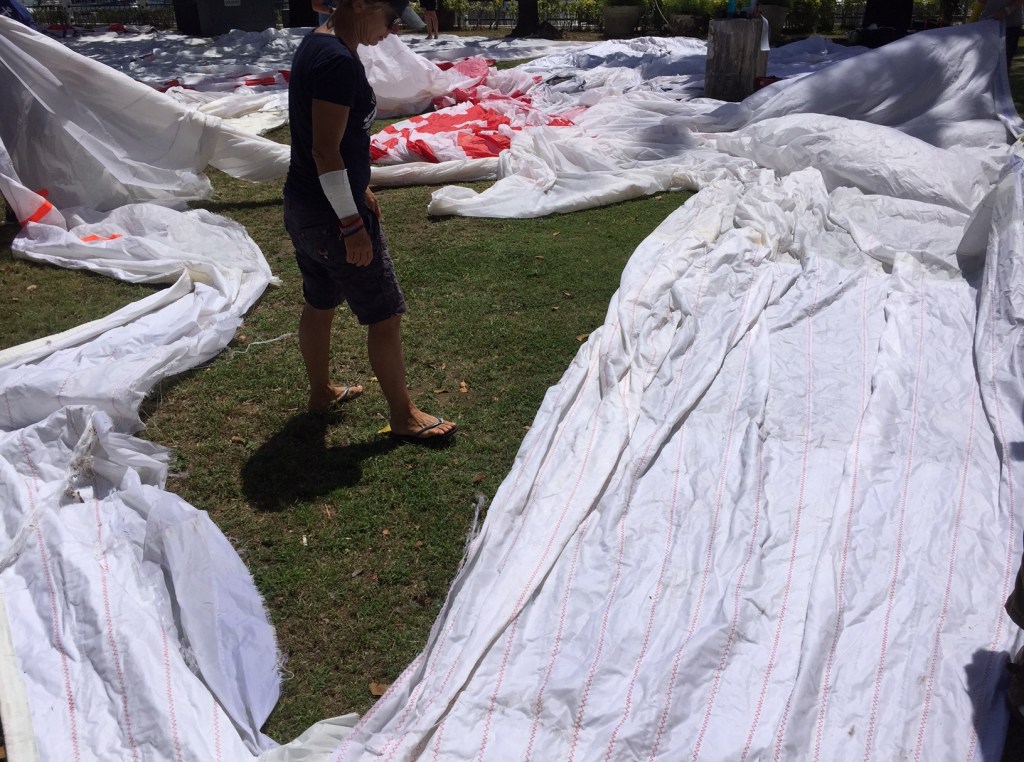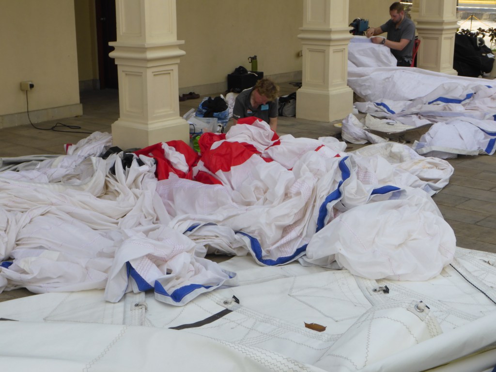 But at the end of the day we wee able with the help of Martin, the sail maker fro Hyde to put the sail together. Now it was all about reinforcing it and sewing it together. But as it was 5pm already we packed the sail away in our open skied sail shop. This was for tomorrow for sure.