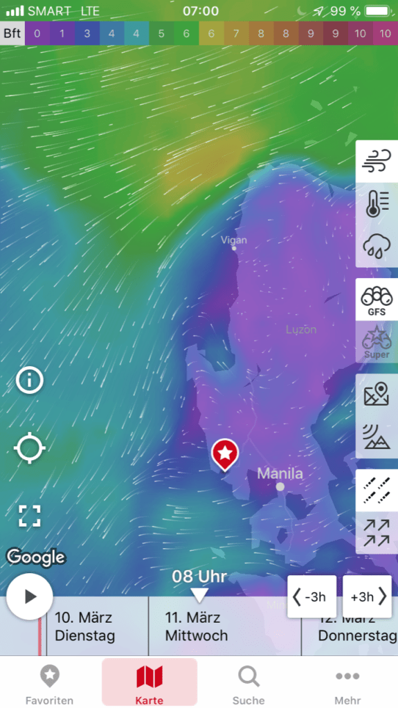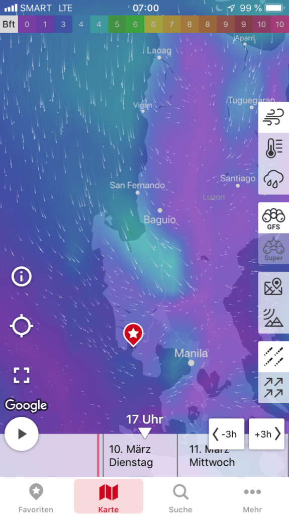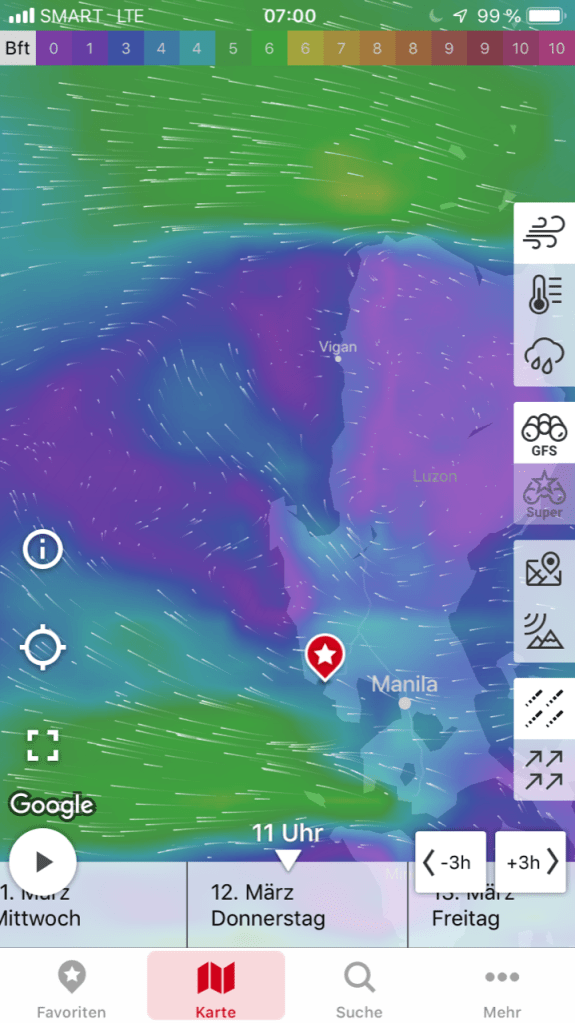 Obviously nothing happens without weather in sailing. So we had a wether brief. And as it looks the winds West of Lucon should be OK and not as unstable as in the last two passages of the Lucon straight. But as I can see there will be lots and lots of sail changes as the wind will vary from 1Bft to 6Bft and will shift from N to SE multiple times. We will have to work a lot and sleep very little.