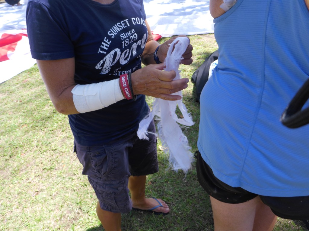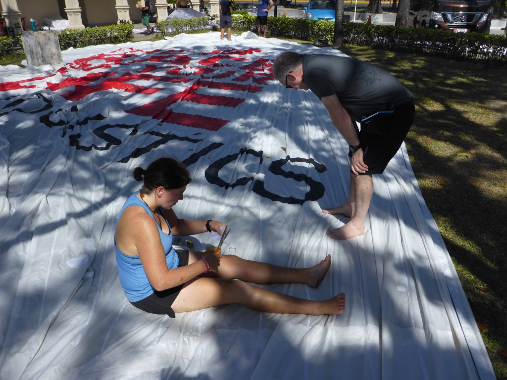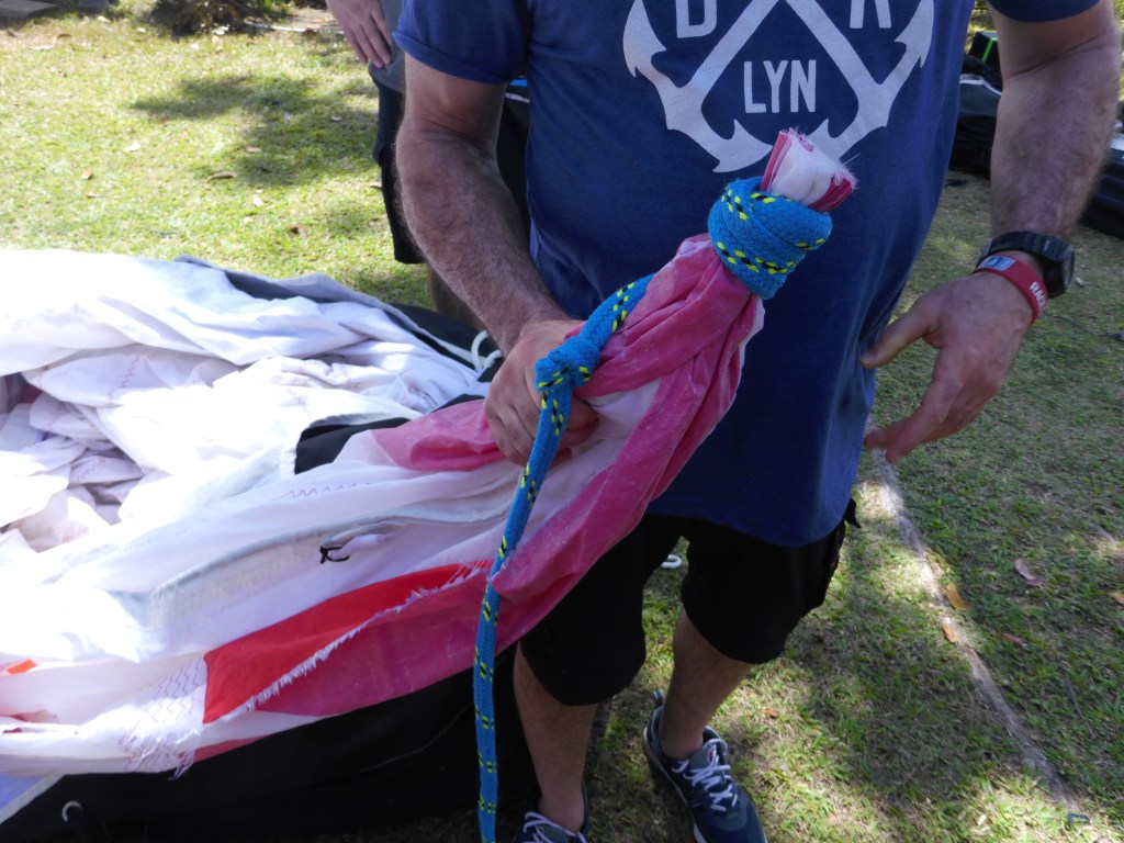 Next was to bring the Code 2 to the lawn in front of the club. Susie and Laurance are our qualified sail makers responsible to keep the sails in good shape. And this time there was loads of work for them because especially the code three was not in a good shape. There was an incident out at sea where the halyard snapped on the Code 3 while sailing, the sail came down and the boat ran over it. According to Susie the sail was literally wrapped around the kiel and nothing could be done to get it out. Therefore Rich and Dan decided cutting the sail to recover it. But you will see later. At this time it was Code 2 and Code 1 that we inspected thoroughly, The Sails were in good shape and only minor repairs were required.