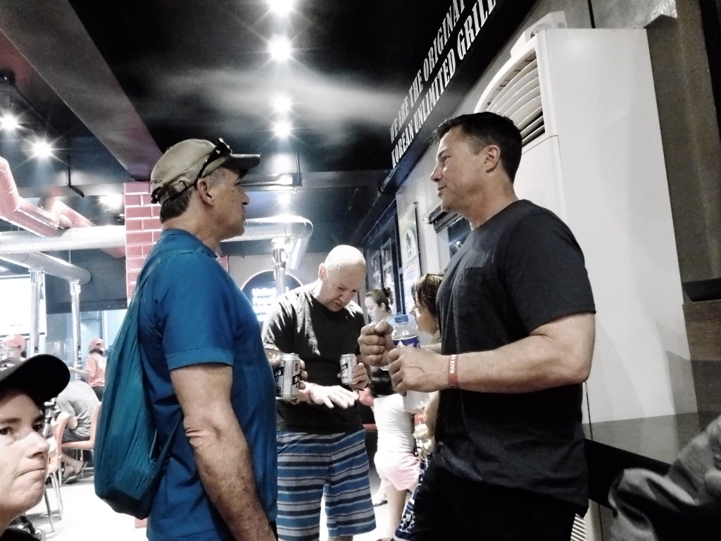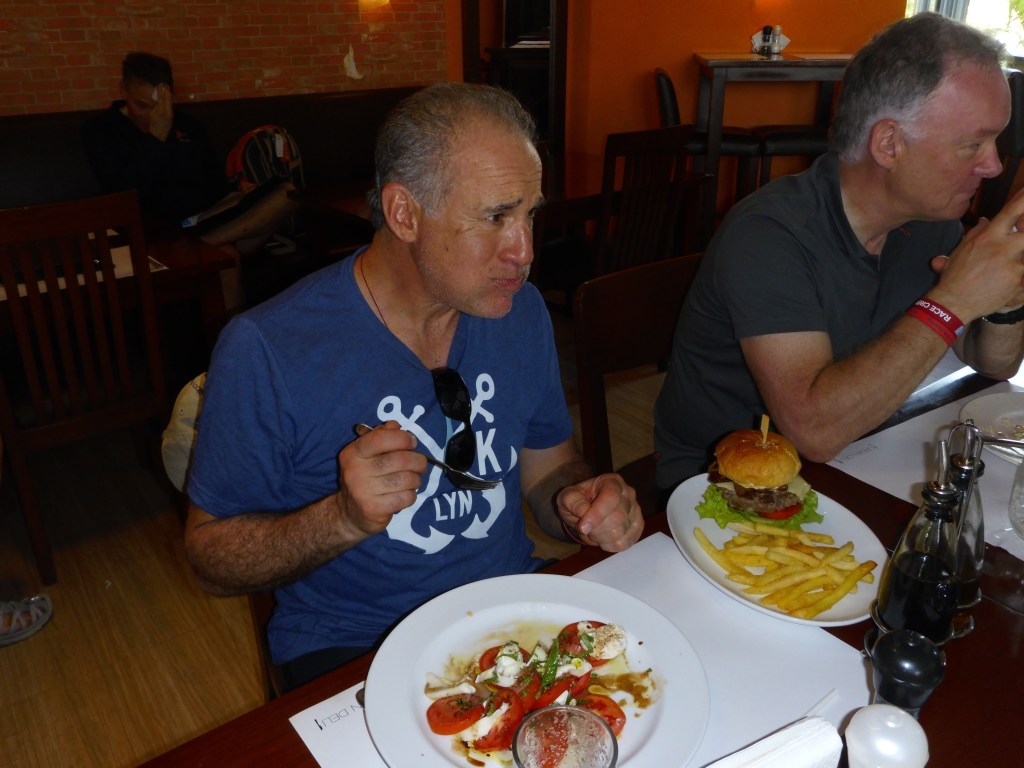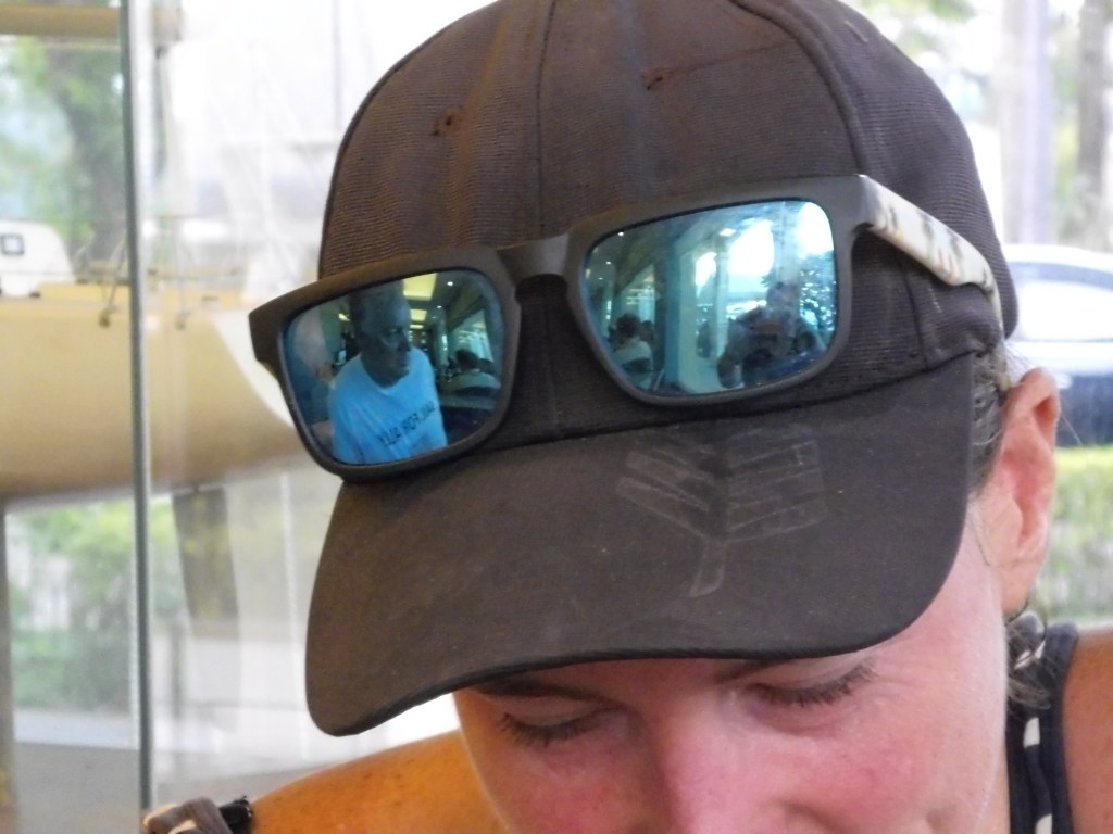 The hole was big, basically the horizontal cut from the leach to the center and a vertical tear from the head down two thirds of the sail. We laid the sail out and consulted the sail maker from Hyde how bad this is in his opinion on a scale of 0-10 and he replied it would make barely a three. But for us it was huge. We were given a strategy ho to repair it most efficiently. Rinse the edges to get the salt off, tape the vertical but first, transfer the sail fro the grass to the concrete sidewalk and take it there from top to bottom. But after rinsing it it was time for lunch. Susie took us to a Deli around the corner. It was a big surprise because the food was exceptionally good.