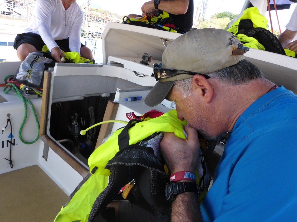 After these announcements we went into refresher training alongside after the rest of the crew was send back to continue the repair of our Code 3. We checked first our life vest. Interestingly enough I got the life vest number 9. Why is that interesting? When I had my Opti „Spatz“, the boat that I learned sailing with it was marked with the number 9. I take this as a very good omen. We went through all the checks on this vest, a Spinlock, which became my absolut favorite after the L4 training. We inflated it and left it at that for a few hours before we packed the vest together again. We were instructed by Rich to perform this test every Wednesday. This is very important and actually essential. The bladder of the vest could have been pinched. And you like to find out before you go overboard.