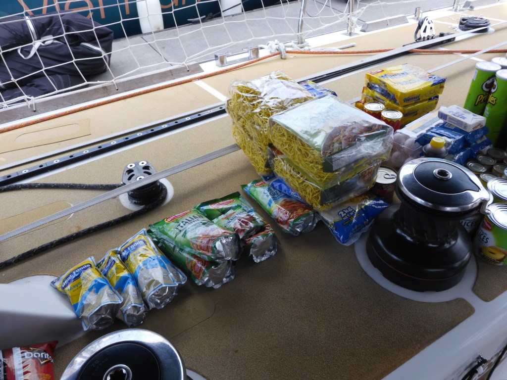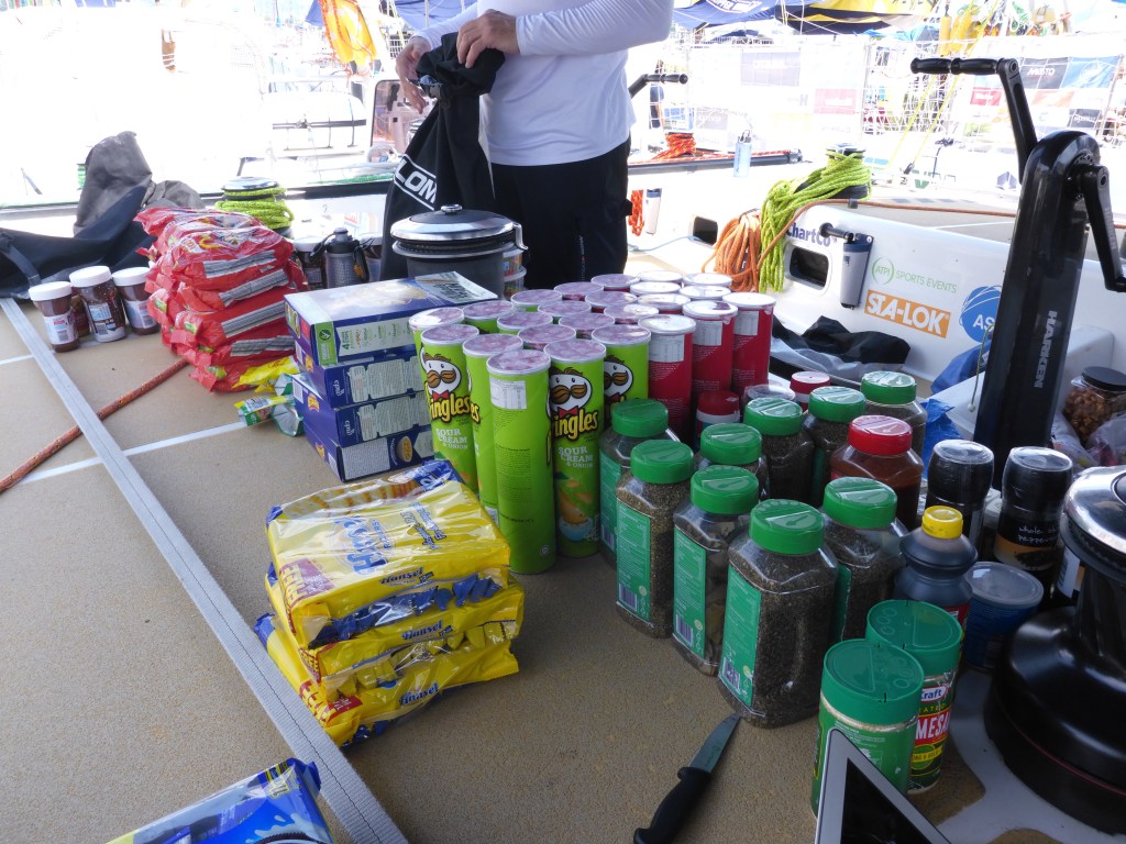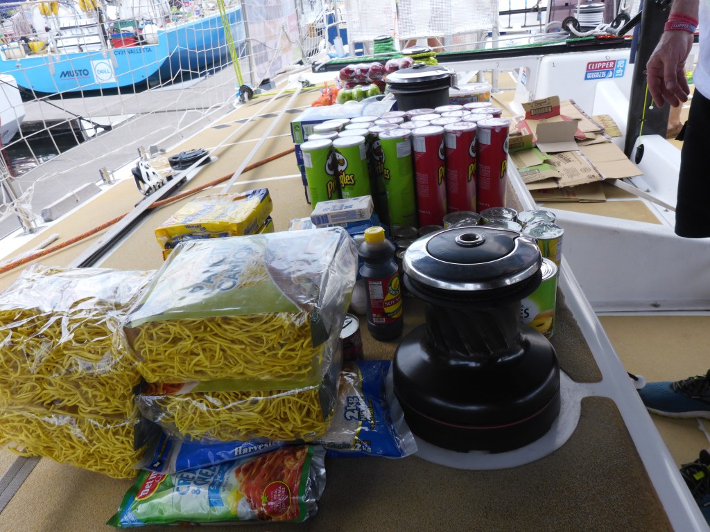 Obviously the boat contains already a lot of stuff and in the handover from Rachel and Ben we received an inventory list of everything that was inventoried. Based on this inventory Stephen and I developed a meal plan for the 5 day race and created a shopping list what we would need to complete the recipes. Alog with that we received advice from Rich and also some of the round the worlders pointed at the risks and wishes in terms of these supplies. „Never run out of toilet paper“. „Make sure there are enough wet wipes“ „We need more protein in our food“ „Dont take the risk that we will be hungry, leg one was awful“ „make sure meal are canned food only, the only way to cook is throwing cans into a pot and ….“ „You have no idea what it means to cook at 45 degree angle, make sure it will be not a challenge to us“ „chopping? I am not doing it“ „make the stock transparent, it does make sense not to know where stuff is“ „snacks, snacks ist the most important things“ „Pringle Bells, Pringle Bells, Pringles all the way…“. Jiwizz all this good advice, we both got scared even for this short haul race. And than we do have the mighty Pacific in front of us. So for us it is not only the sailing challenge but also the challenge to create disappointments and grief. We for sure could make sure that 2 out of 17 sailors will be happy, thats ourselves. But for the other 15 it is a big challenge keeping them motivated and well fed across the pond in the cold.