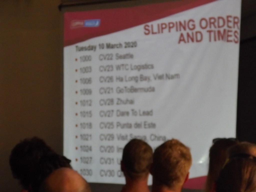 Mark Light and Sir Robin took the stage and after the icebreaker of the day, provided by Dare to Lead to Mark, a wet icebreaker underpants , Sir Robin explained the situation. Basically it was difficult to make a good decision which would cater for all eventualities considering quarantines, visas and so on. Qingdao, still a preferred place was out because of the risk of two weeks quarantine. South Korea, the preferred option was out because of the violent outbreak there. And finally Yokohama offered endless complications due to visa requirements for a number of crew which could not be solved easily. Therefore the decision was taken to go Subic Bay direct to Seattle. Race start would be March 21st. We would be 4 days longer at sea which means 29-33 days at best. Silence in the room. There was more to come.