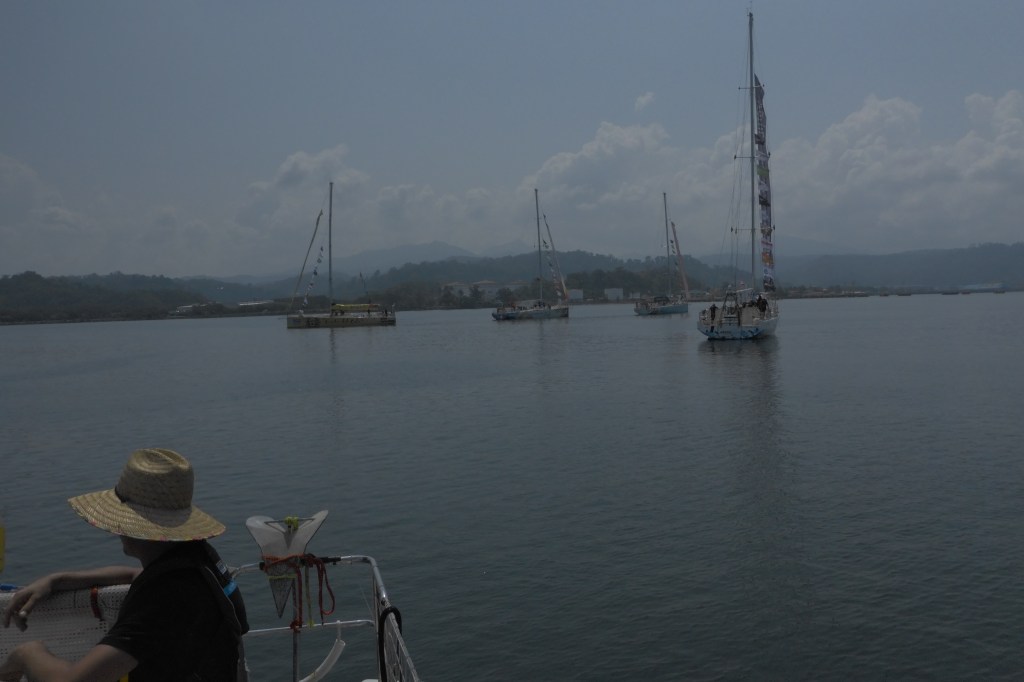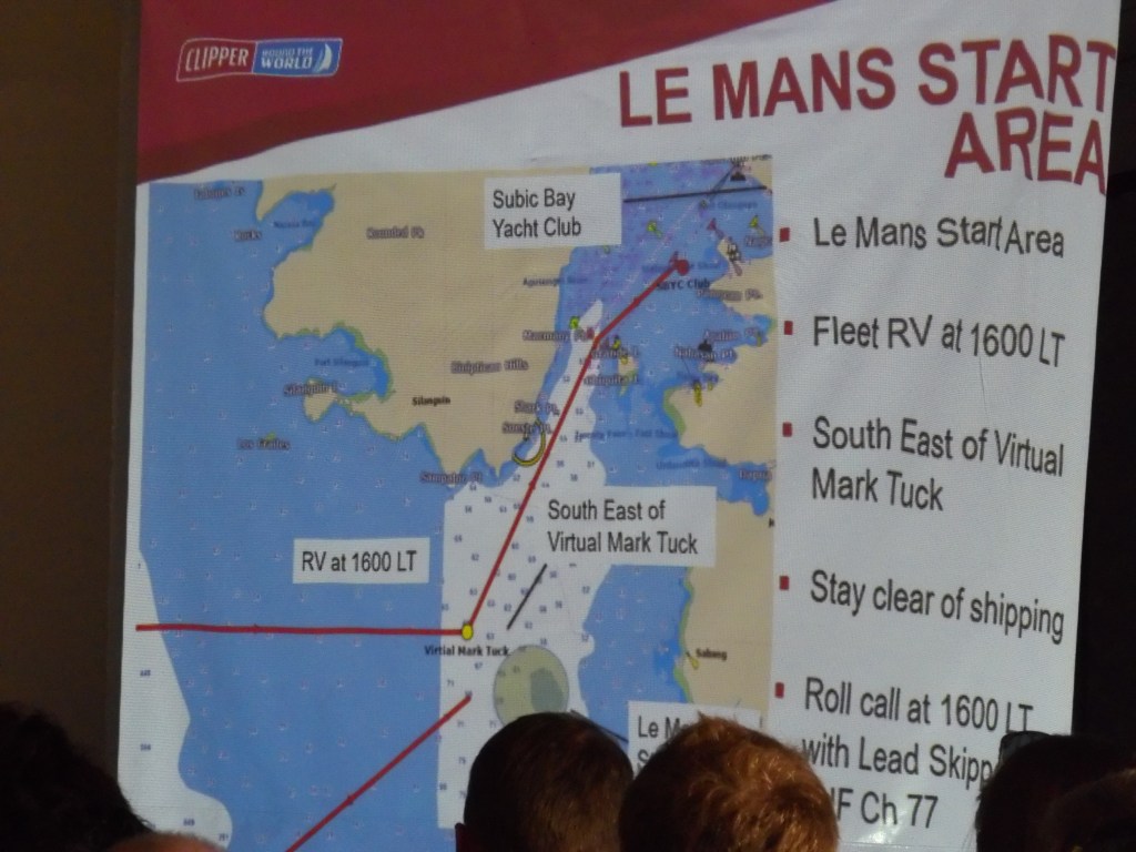 It was a busy day. Stephen and I came in in the morning to make final touches to food storage and location. We found more stuff. And at 11 am we had the crew brief of all crews about the details on the course, the weather the overruling safety instructions and some very good media footage from the legs and race before. We head out west and will run a triangular course. We will be out there until the 15th. So about 200 miles West, afterward we will turn NothNorthEast for a bit more than 200 NM followed by a SouthSouthEast course back to Subic bay. It will all start with a Le Mans start. Yes guys at home, you might not be familiar. Here is how it works. There is lead boat in the middle and half of the fleet to the windward ward side, the other half to the leeward side. This time Rich is the race start director and WTC Logistics will be the leading boat. All boats will line up under motor. Main is hoisted and Staysail as also a Yankee handed up. There will be a 10, 4 and 1 minute start sequence. At 1 minute all engines are supposed to go off. At the start signal the Stay and Yankee can be hoisted. After the start the fleet will maintain course for 10 minutes and than we start fighting.
