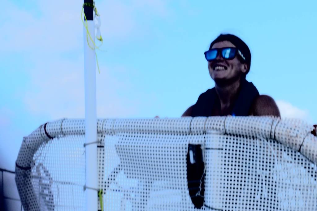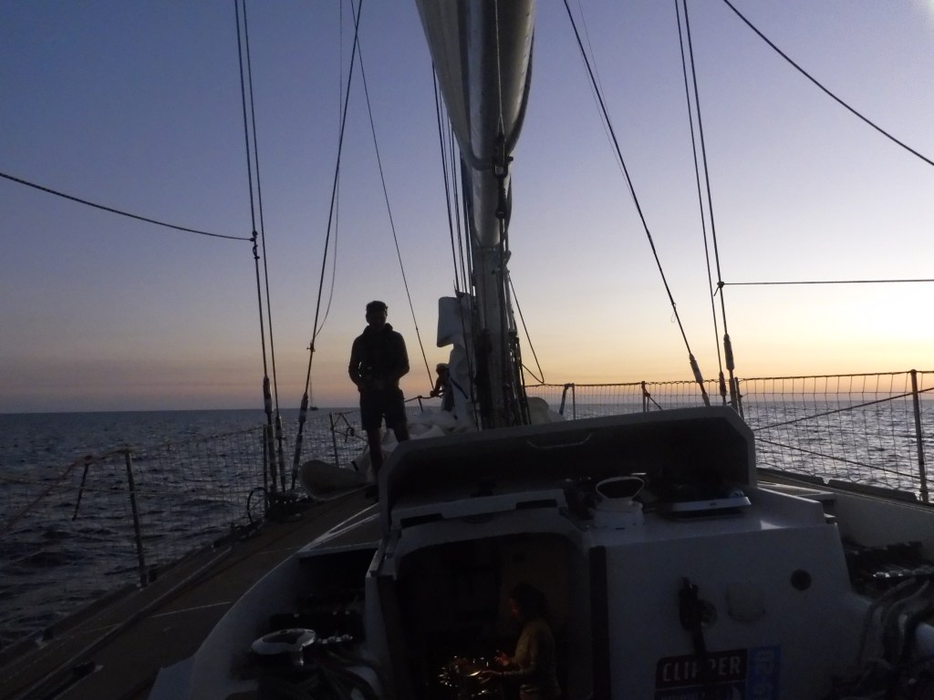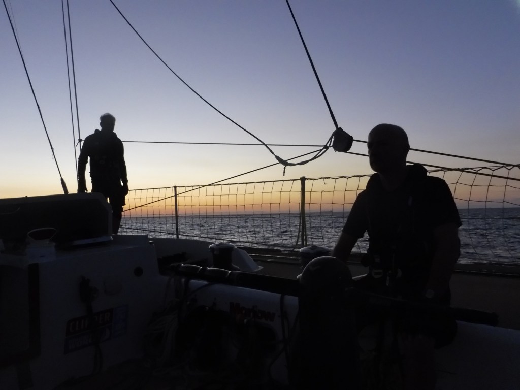Dad heute um 16 Uhr: Quick update. Took the watch from 6pm to 10pm and will have the watch 2am till 6 am. What a brilliant watch. Gorgeous so meet. 15knots of Wind from NNE and low seastate. Still on a fine reach with Yankee, Stay and main. We now have 56 Neto the gate of he finish line. Pushing the boat hard. Every 10 minutes trim check. It is still 27 gehrend out there and we are sailing, no, storming through a pitch black night at the horizon and stars above. I helmed for an hour. Let’s de is good. Sleep now!