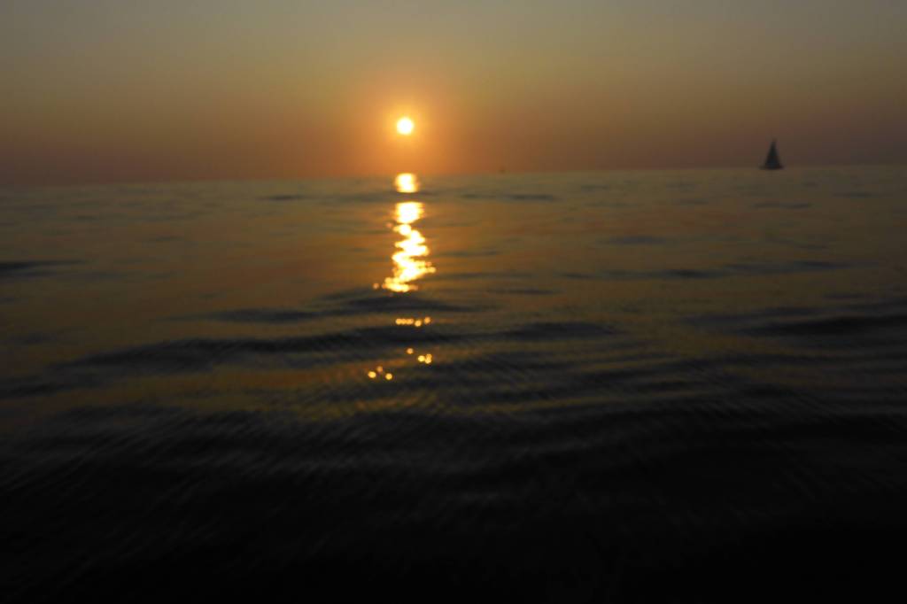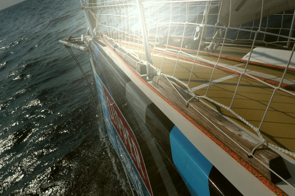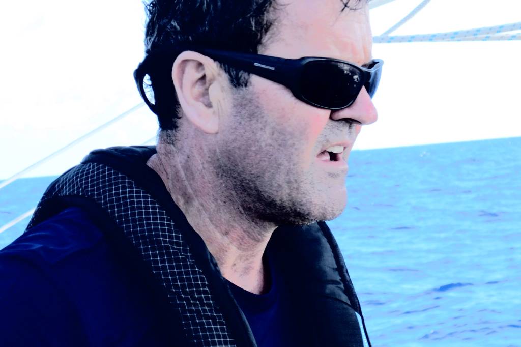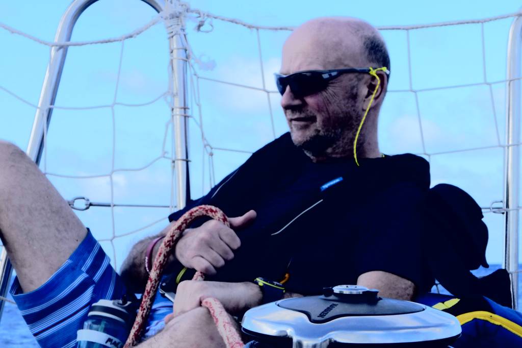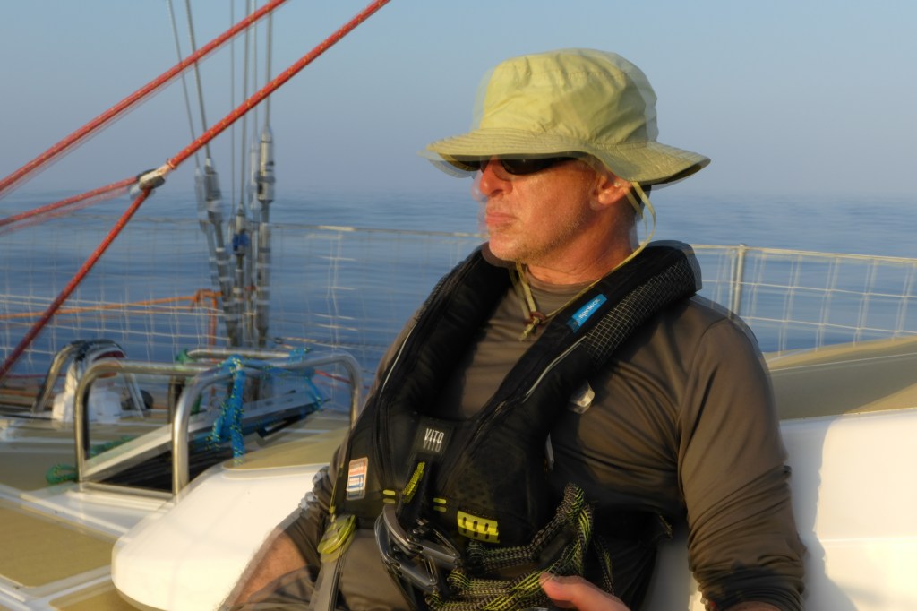The wind died to about 4 knots true. First thing was to drop the Stay. Not enough. When the Yankee became the shape of a wet towel we decided for the negligee, the Windseeker, semi transparent and living up in the slightest touch of wind. We crawled along and did not want to believe it hat we again tried sailing on a mirrored sea. But we first awarded by an amazing night sky. Around midnight the red half moon glared over the horizon turning the sea into a bronze silk liner. We peacefully glided across the waters. And although this was a great view we were all desperately hoping for wind, not a breeze. We had enough of the banging noise of the rigg. Where is the action. After a restless night I went for breakfast. I noticed that my dark blue shorts started to turn white. No not sea water, I am priced by salt myself. Dried sweat turned inside out. Hey but what can you do when you sweat like a pig for four days 24 hours. I only have one pair of shorts and only one long sleeve UV protection shirt (which I decided not to wear in bed any more. I use a T-shirt in case I go to bed). Anyway in the galley I got two slices of toast with Marmelade (Orange!) and a mug of horrible coffee. But this shook me up since I had a net to f 4 hours sleep since we left. I was watch leader today. I stepped into the dark cockpit “morning guys” was repeated by grumbling “mornin”. Yes these guys sat there since 2 am. But hurray, the kite was up, we were heeling 45 degrees. Amazing. Kaz transferred the watch and I took the helm. Instruction was easy. Do 60 true wind angle until you passed the crossing LOG tanker. Than bring it up to 50degrees. So I did. The bottom of the kite touched the water at 50degress by about 10%. The helming instruction could have been much more simple. Drive the boat with a skimming kite and you will be alright. Tellyho. 10.6 knots and a race de on a razor blade. This was sailing. The sun came up and welcomed our effort. A glittering sea, fairly calm sea state, true wind 5.8 knots, apparent wind 7.8 knots and we were doing 10.6 knots with 220nm In front of us. Blooded hell. I love sailing. I love this type of sailing pushing a 46 ton battle tank through the water. Joy and happiness and big smiles. I called Steve onto the helm. A newbie. Let him dance on the razor blade. It took some coaching but after a while he did well. Apparently our wind angle was not sufficient for the gate. We hoisted the Yankee, dropped the kite, hoisted the stay and puffed up by 30 degrees. Hard work but spoiled down like clockwork. Rock n Roll. I love good maneuvers when sailing. Wow, this day is my day. But I asked myself why it was already so hot at 08:30 until I realized that I still had my BR1 jacket on. Free sauna, no charge. This is what I needed. I was soaking wet, I mean sweat dripped out of my arms. I needed a dry up. So downstairs (remember no change cause I only have 1 shirt), off the life jacket, off the jacket on the life jacket and out to the cockpit. I crawled up to the fence and did the Titanic Kate Winslet dryness Nbg Action into the wind. Spreader arms and 5 minutes later the shirt was “sweat dry”, good for another few day I’d say. We continued with 10.6 knots on a fine reach. We continued to enjoy ourselves. Sailing almost at its best. Why almost? Because we had almost everything for good sailing. Good company, motivated crew, professional skipper and AQP, sunny sky, warm, warm water, 200nm run ahead with good forecast. But….there is no beer. That fine ice could beer is still 230nm miles out. We will get there, I am sure. Today is one of these days where I feel that I two lives. Birgit is one and I am missing her already. Sailing is the other one. After such a day the world could not be better. Skimming kite at 10.6 knots. I love sailing. Joerg, South China Sea.