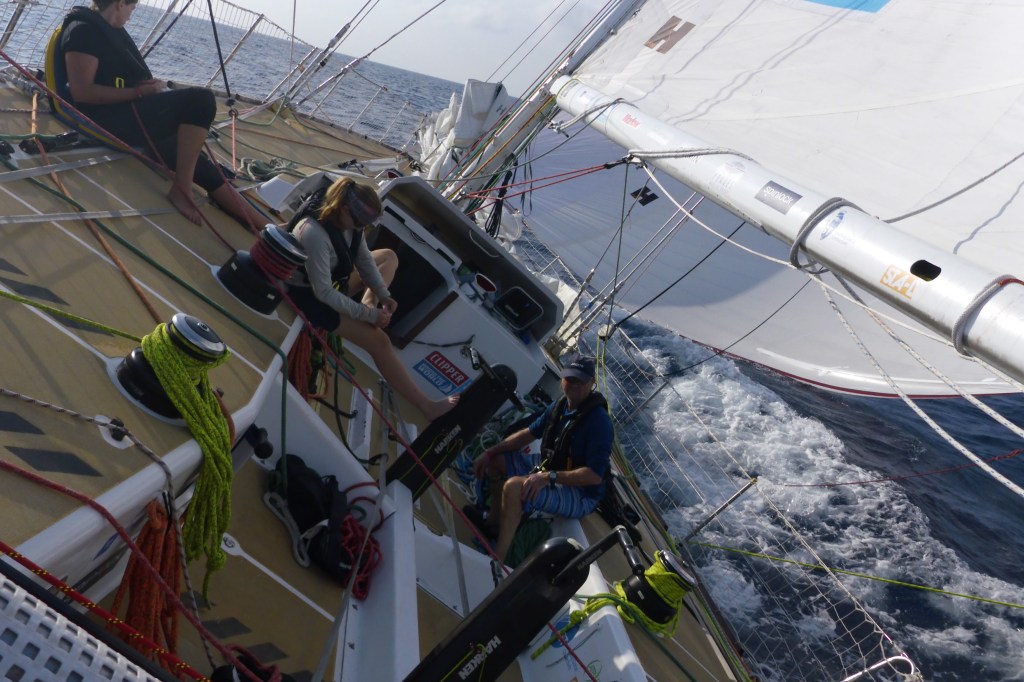 I was on watch from 2am this n but as I could not sleep I went up half an hour early. It was so hot out n my bunk. I slept for an hour. We sailed the whole night under white sails course 270 when Punta pushed from below. I was helming at that time but we dug and gave up windward position for the sake of the shortest course. 04:30 I went down to start breakfast, boiled eggs, pancakes, serials. Once the the galley was clean at 7 am I wrote the crew blog for the boat. But I am not sure if that will be broadcasted. I took a little break below deck and dozed away in the saloon for half hour. After that i prepared lunch – burger bar with Angus beef burger patties and a selection of toppings. Obviously cheese, fresh onions, cucumber salted and spiced as also Sauerkraut for the Lederhosenburger. Galley was pretty messy and from my watch I had no clew if the dish was OK. There is a bit of the weird atmosphere. Anyway. After they went upstairs the other watch was fed. And since they were worked up it seem to be appreciated. Not for long and I will be back at the stove for veggi rice with curry. We will see. We will go back to our second night and I will have a day without special duties.